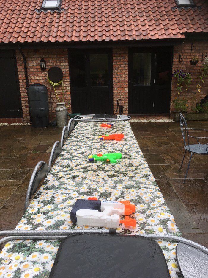 As the rain continues I see, on the trestle tables in the courtyard, the legacy of five little boys who enjoyed water fights during the record breaking heat last Thursday.