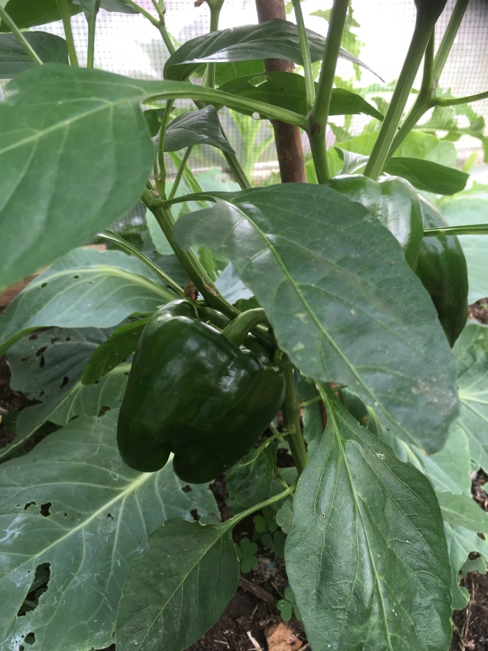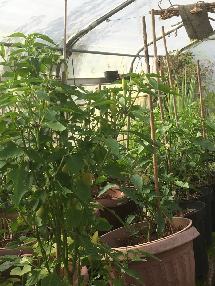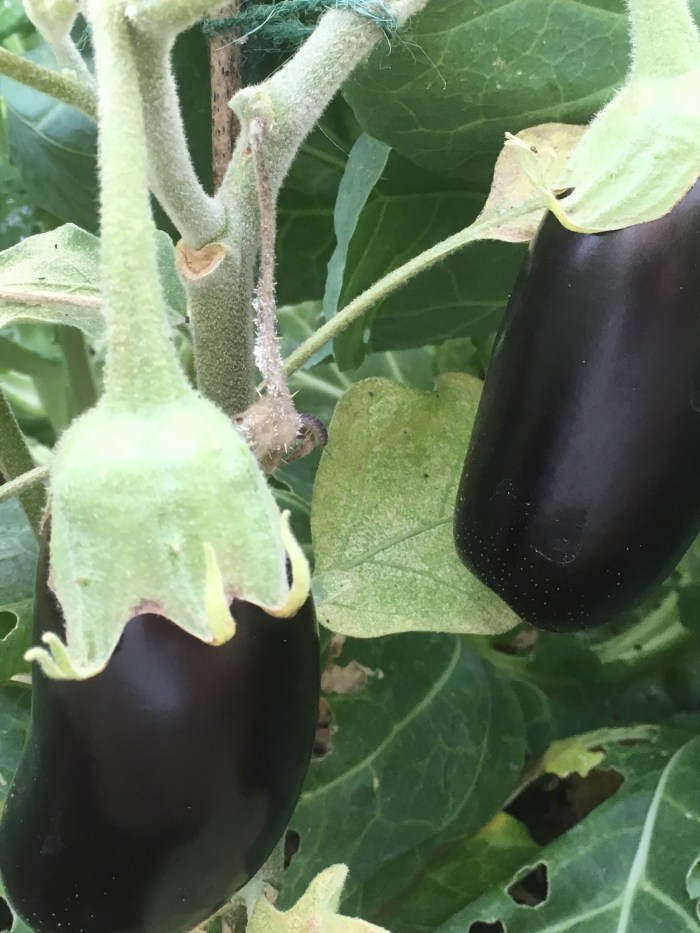This year the green peppers are fat and glossy as are the growing aubergines .