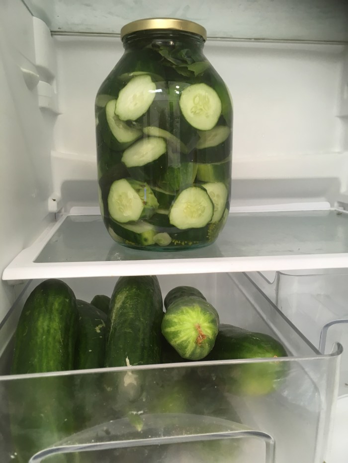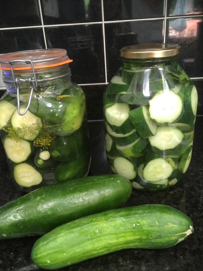 Outside the cucumbers are proliferating and Jeremy picked 12 before breakfast. So it’s pickling time – some in the fridge and some fermenting on the counter.