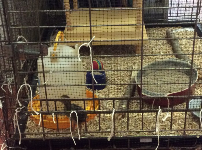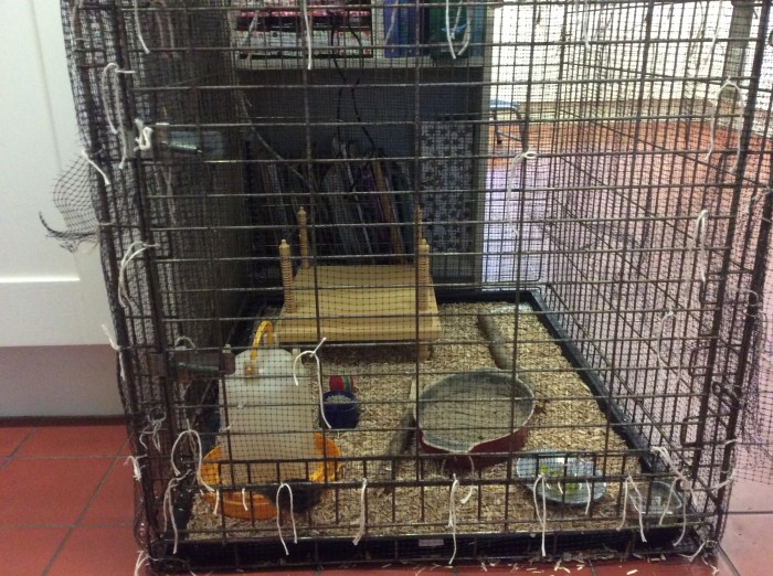Now Jeremy has covered all the sides with netting and I have lined the crate with newspapers and chick bedding. They have some twigs to climb on a ball to play with, food and water and their brooder plate.