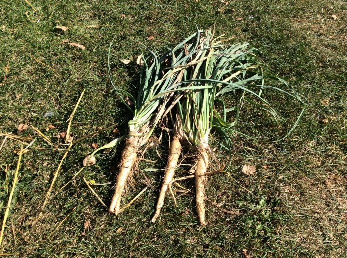 Salsify, a root vegetable that looks like a thin parsnip. It’s a member of the dandelion family and supposedly has a taste like oysters but I have never eaten oysters so how will I know if that is true? Tonight I will peel them and boil them and mash them with butter and cream and salt and pepper. If we leave them in the ground over winter they will sprout edible green tops.