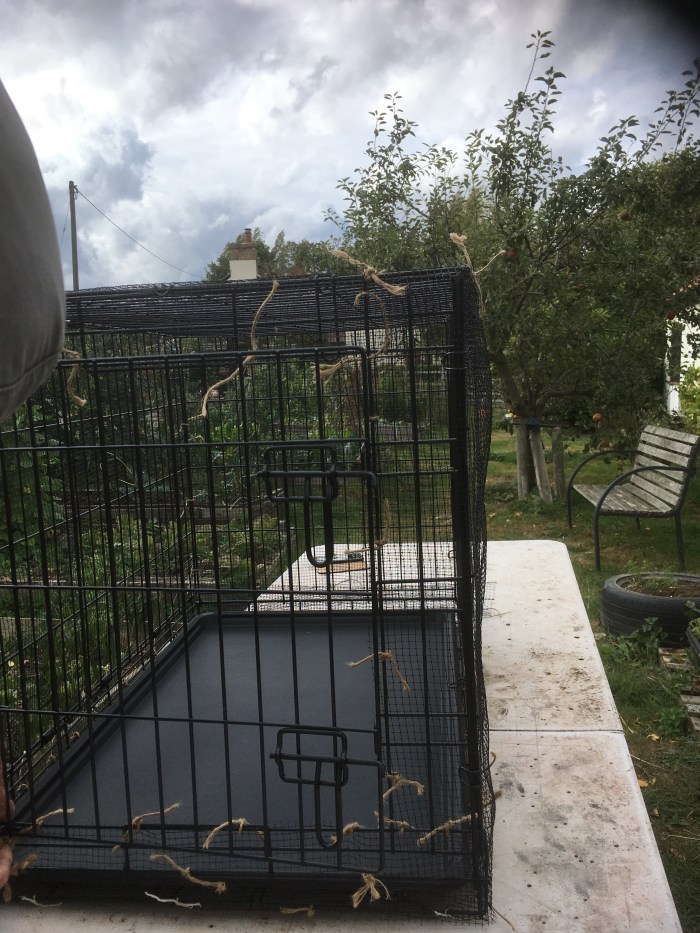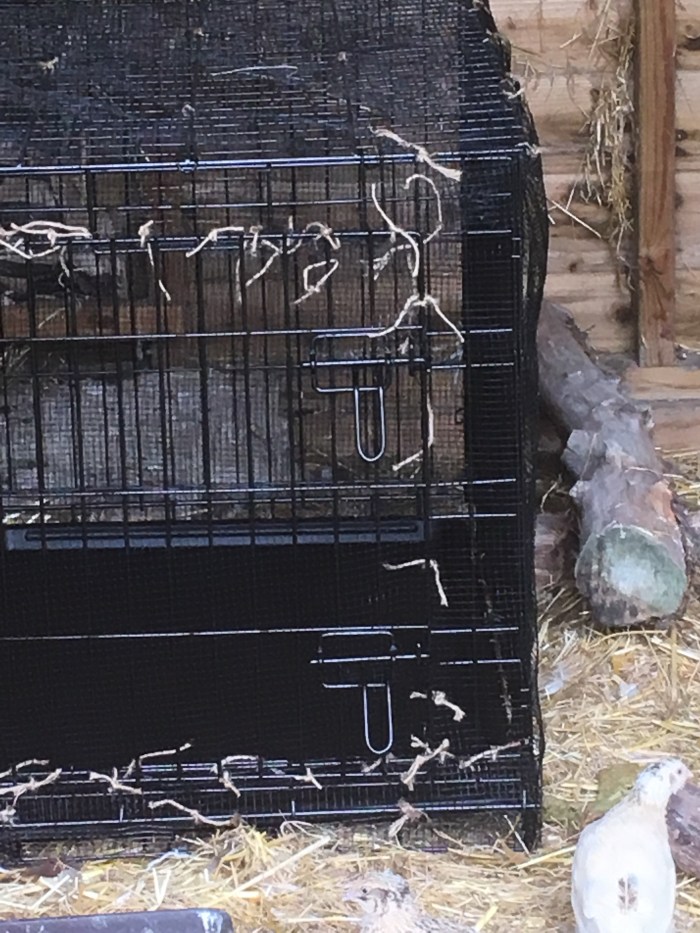 After making a perfect nest and sitting so beautifully we were counting down the days until the new babies hatched. In anticipation I bought another large cage to protect you and your chicks from the other adult birds and we have just finished covering it in netting.