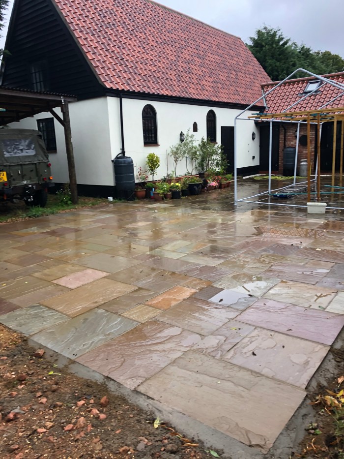 Good on Peter and his men, who finished grouting the new paving slabs in the front of the courtyard last night. Just in time.