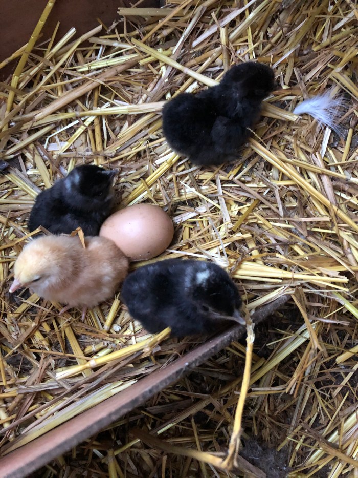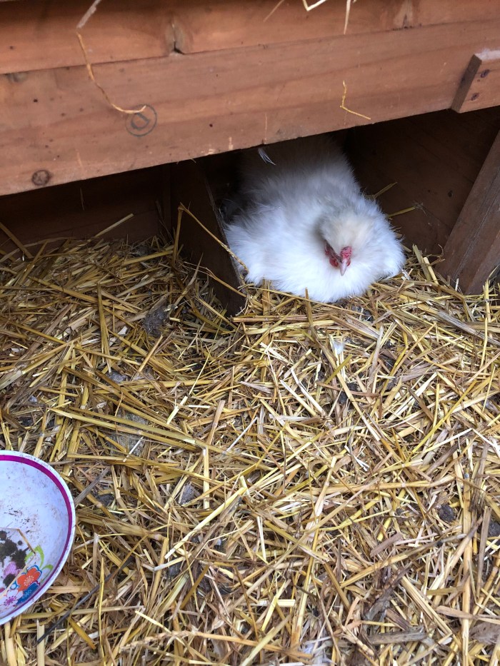 Bless her, before her last chick has fully grown she nested UNDER the Silkie house and she now has five baby chickies. One unhatched egg remains.