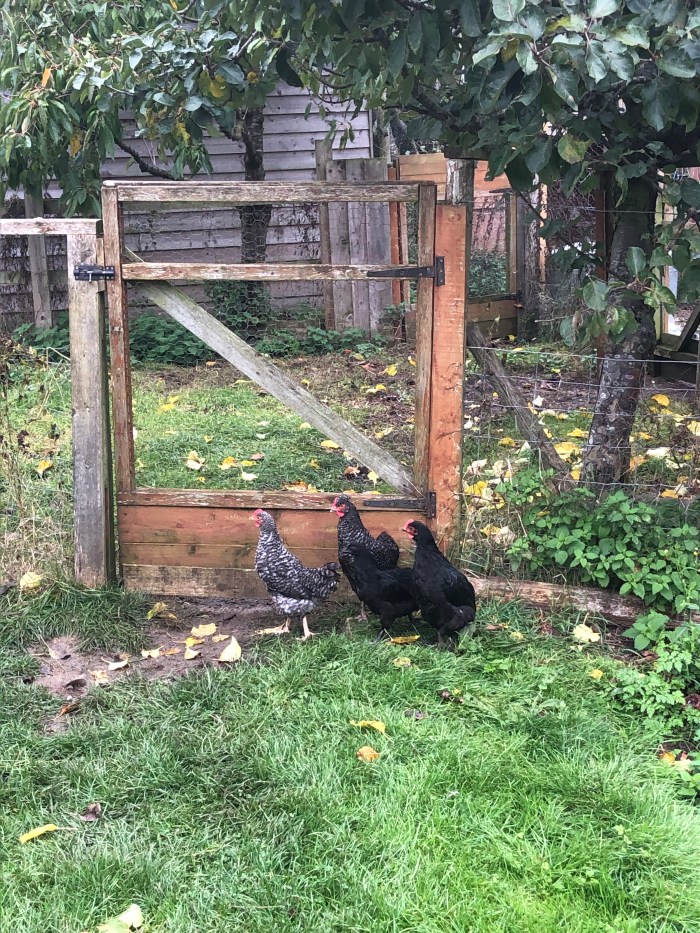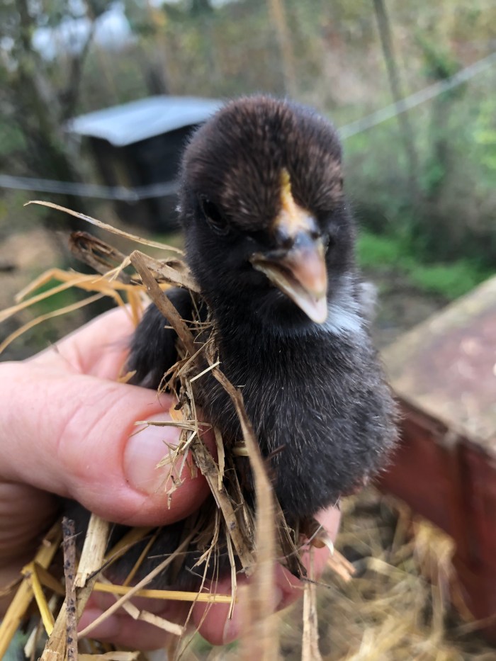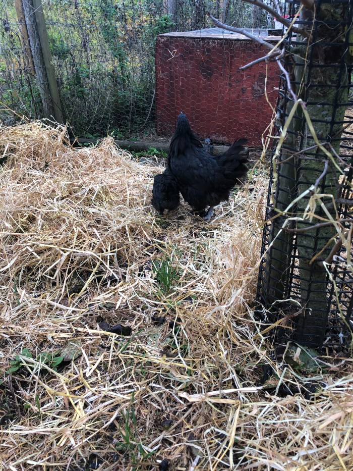 The black hen with her singleton chick are now in the orchard with their own little house and outside area.