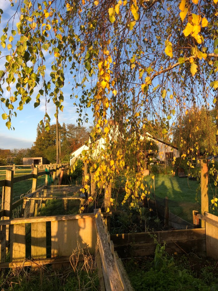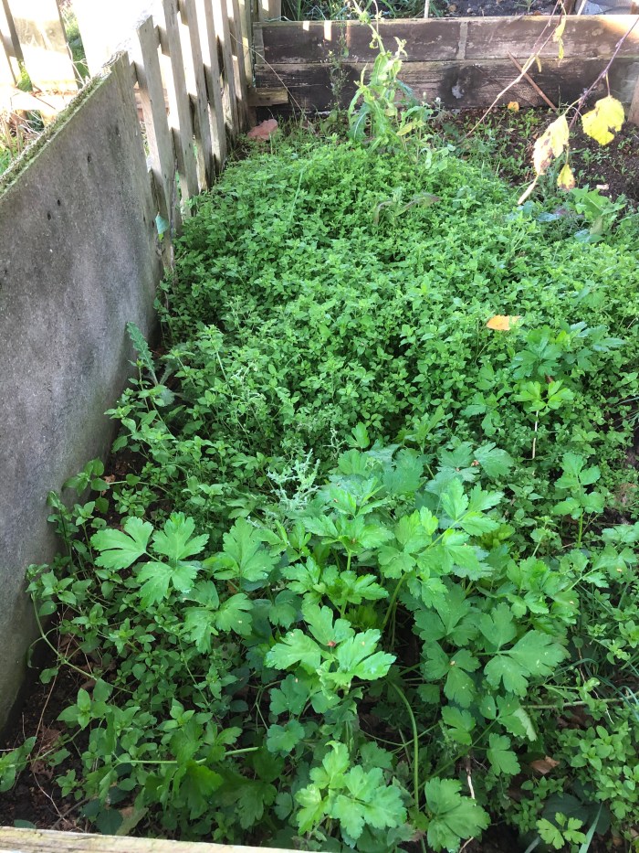 A glossy, green parsley plant has seeded itself in the raised bed underneath the silver birch tree. I chewed on a leaf as I waited for the hose to fill up the water troughs.