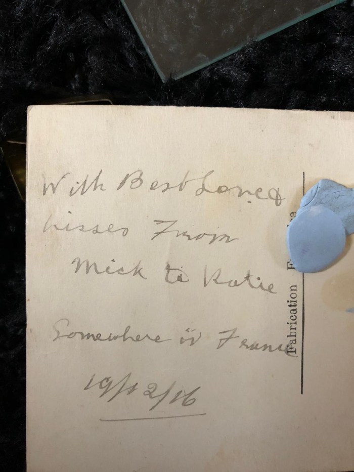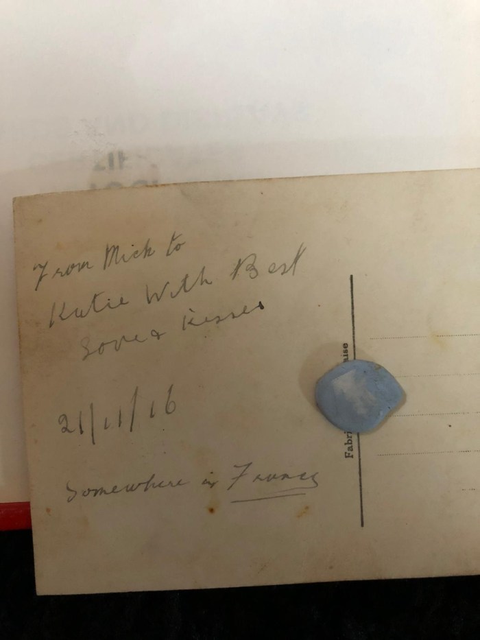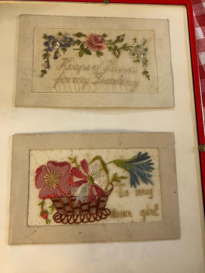 My grandfather survived the Battle of the Somme. His wife, my grandma Kate, had (before grandpa Sam came into her life) met a young boy from New Zealand. They met at a dance in London on his way to fight in France. He sent her embroidered postcards from “somewhere in France”