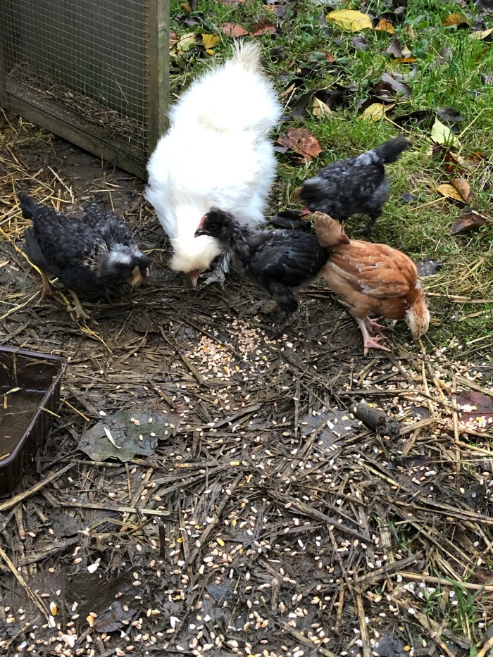 The chicks enjoy their corn and a present arrives for the goats.
