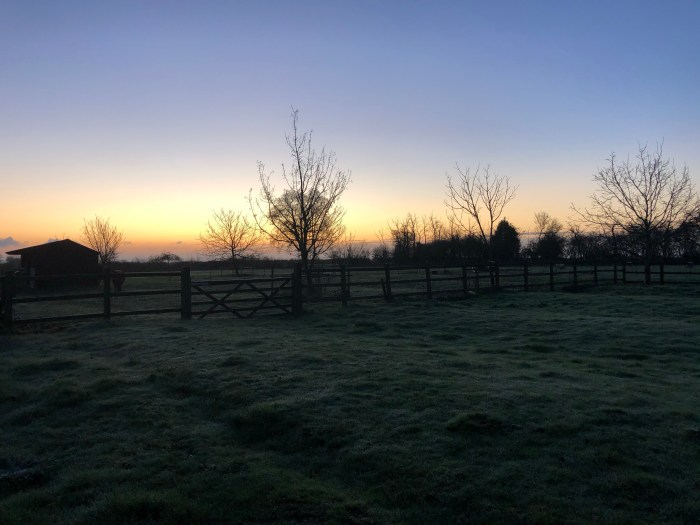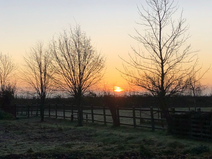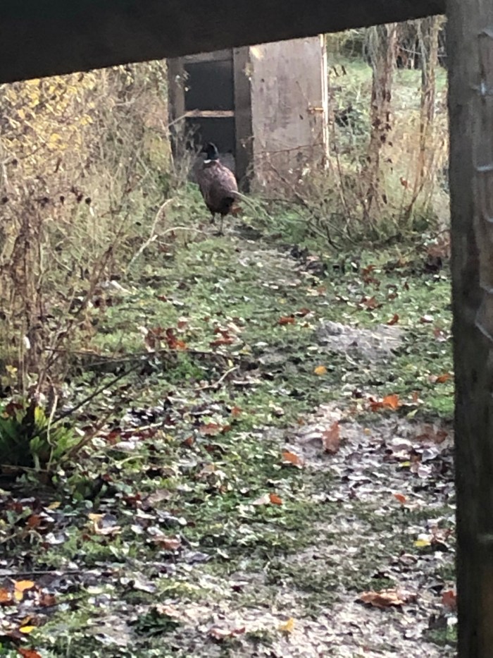 As the sun rises and I take food to the geese, I catch sight of the pheasant who regularly helps himself to goose food. An enterprising bird.