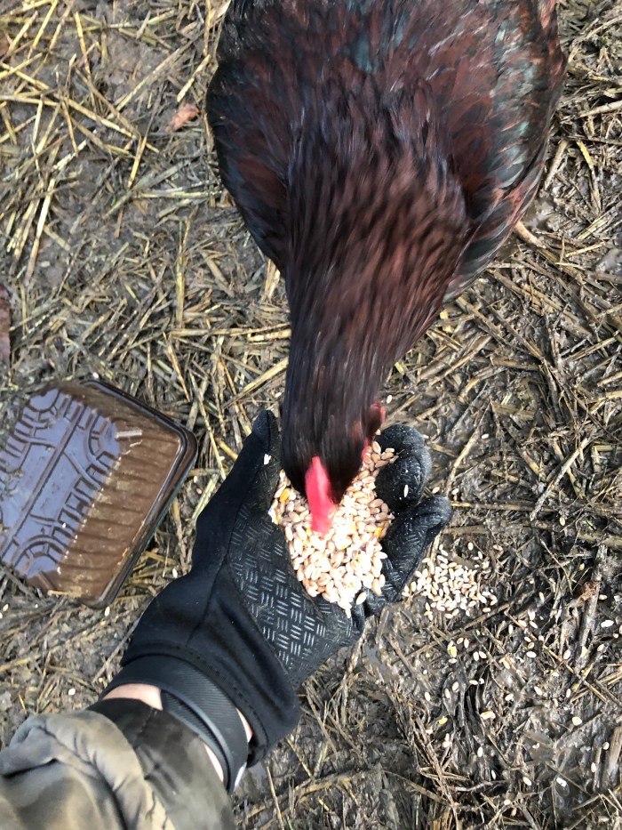 The largest hen, Mrs Orpington, is also as friendly as can be and I discovered that she likes to be hand fed her corn rations