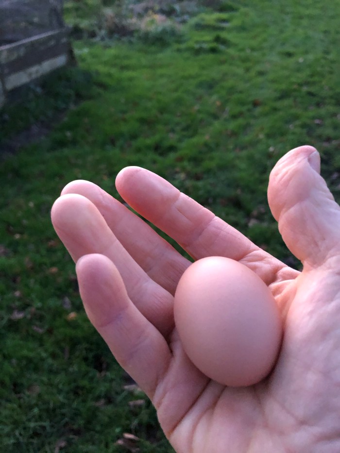 we find a small, brown egg laid by one of the adolescent hens. Well done