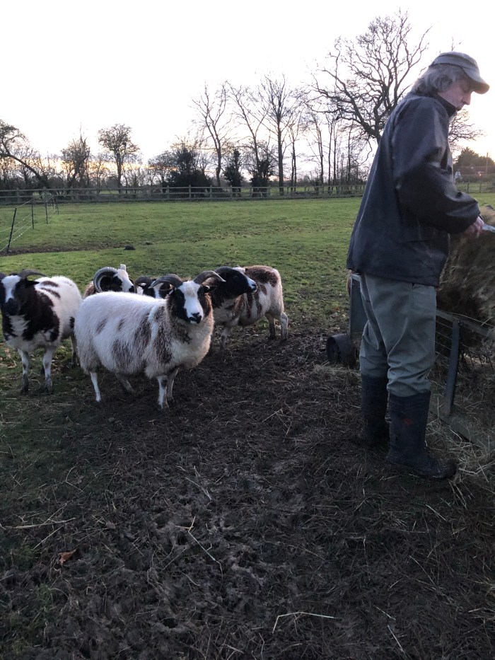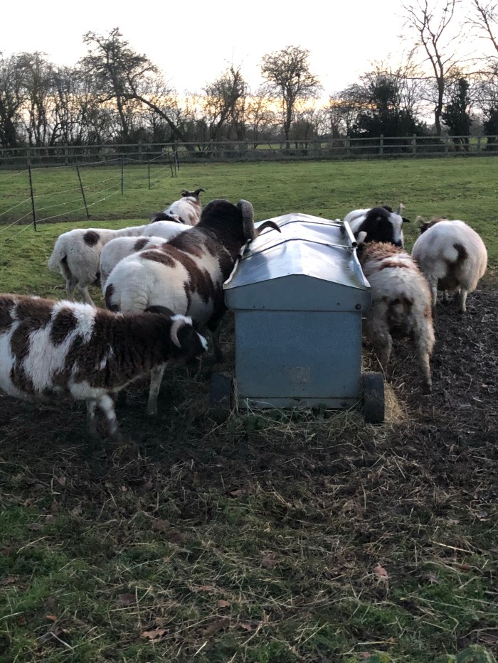 The sheep gather around the hay feeder waiting for a fresh bale.