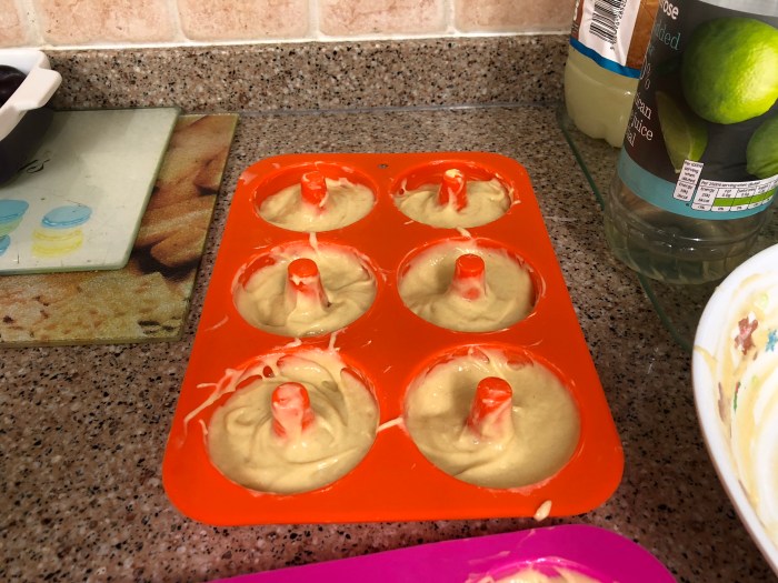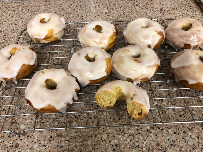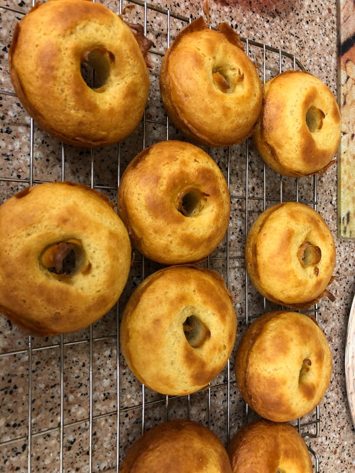 We traditionally eat donuts and other “slimming!” foods. I made baked NOT fried donuts this evening. My first attempt. Bottom picture reveals that I tasted half a donut. I think it passes muster.