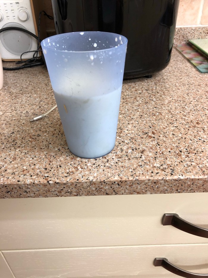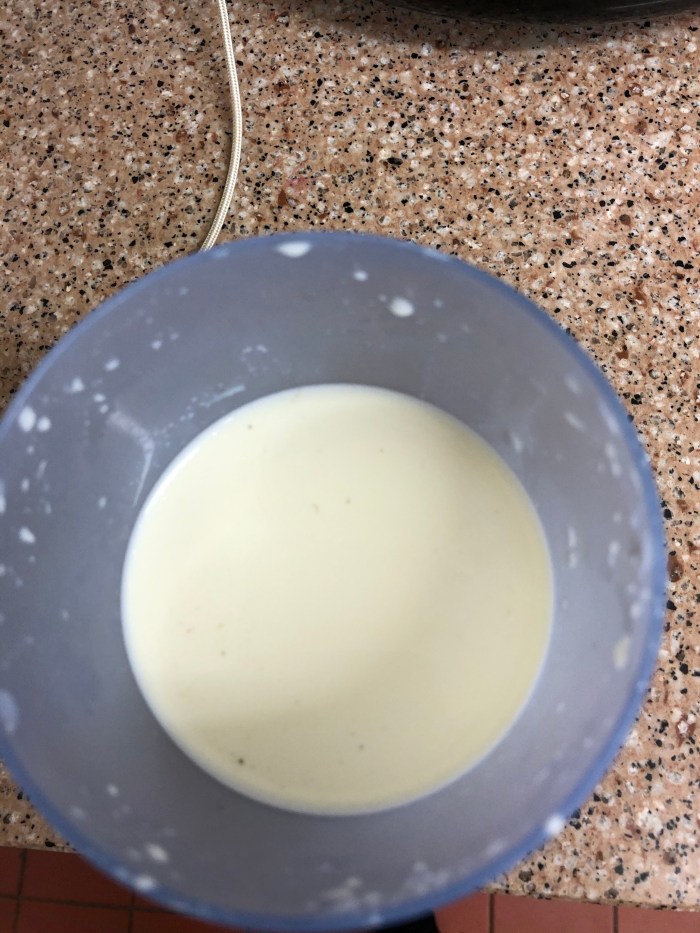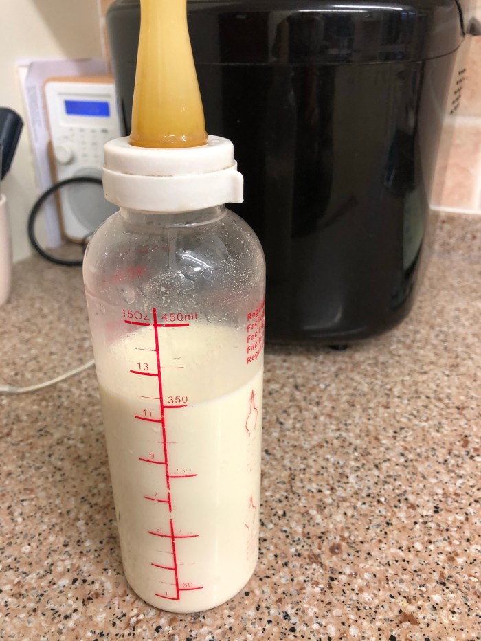 In preparation for a possible third night in the kitchen, J has just milked Perky. The lambs have spent the day with mother, showing signs of feeding from her. We are giving them supplementary bottles to build up their strength. If we bring them in tonight we now have 350 ml of fresh sheep milk to feed them.