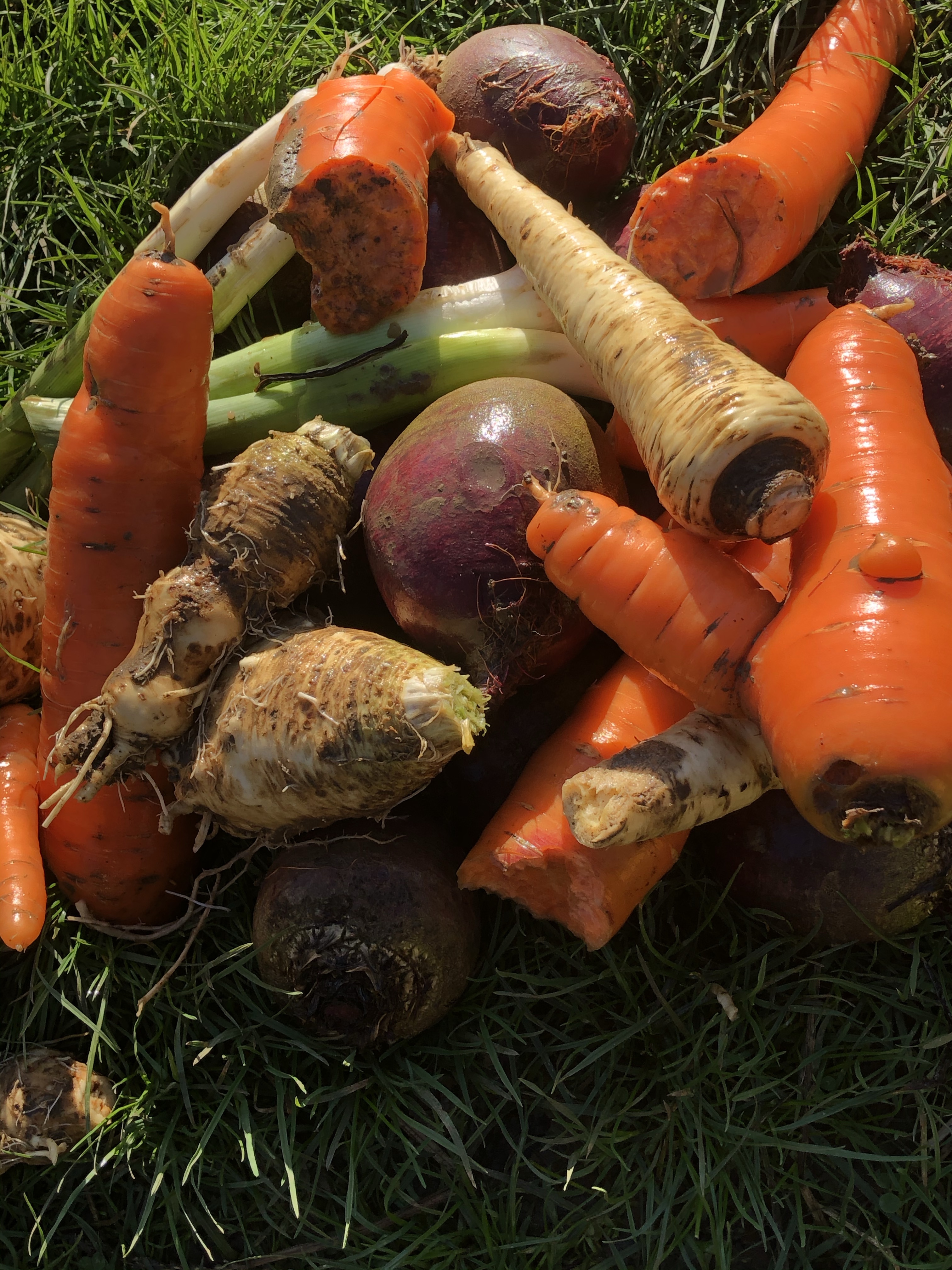 There is a pile of freshly dug vegetables to be peeled and cooked