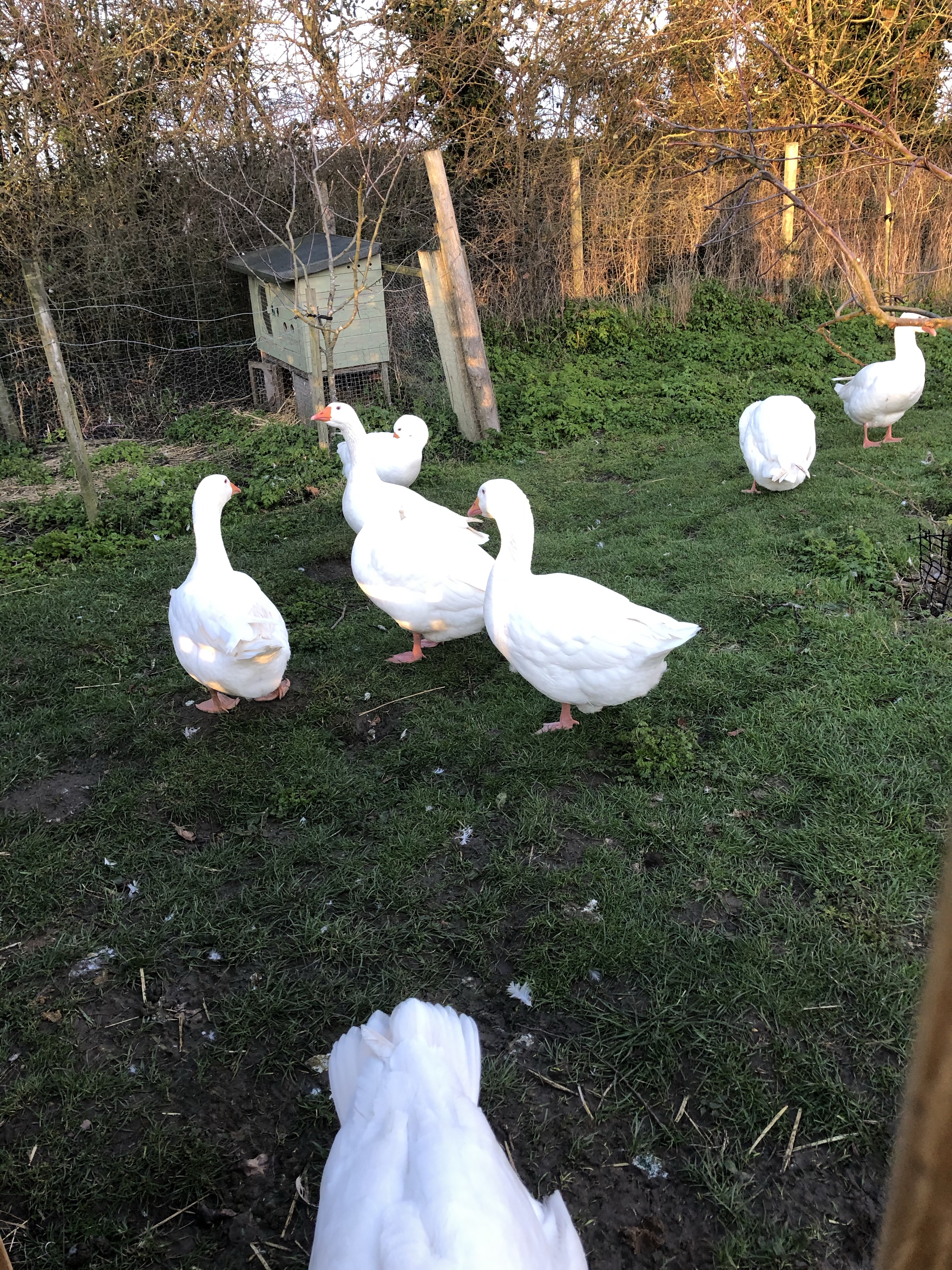 There were only eight – one was missing. A pile of feathers in the far corner of the field (beside the goose gate) pointed to a fresh attack by a fox. Drat! We shut the goose gate. No more wandering for the big, white birds. This new attack gave us concern for the twins and we have moved Helly and Angel into the barn tonight.
