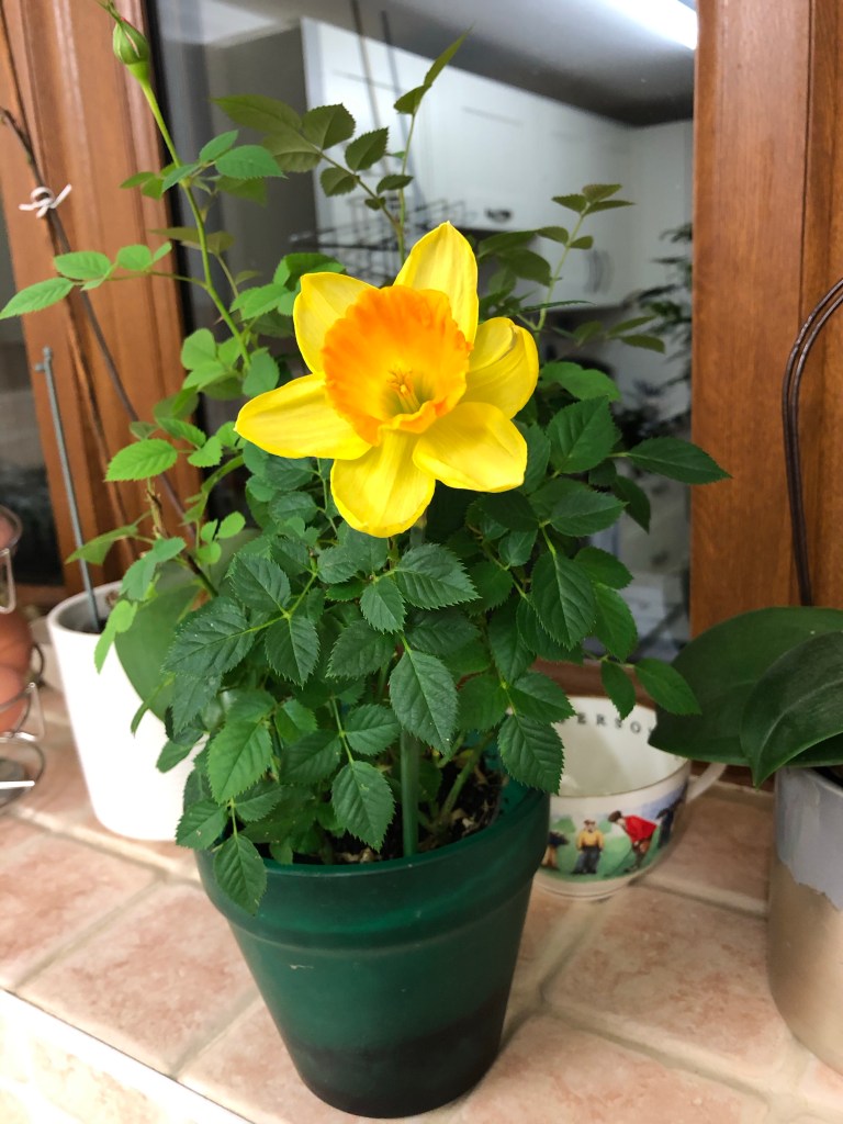 This week he also put one of the stems in a pot that holds a miniature rose.