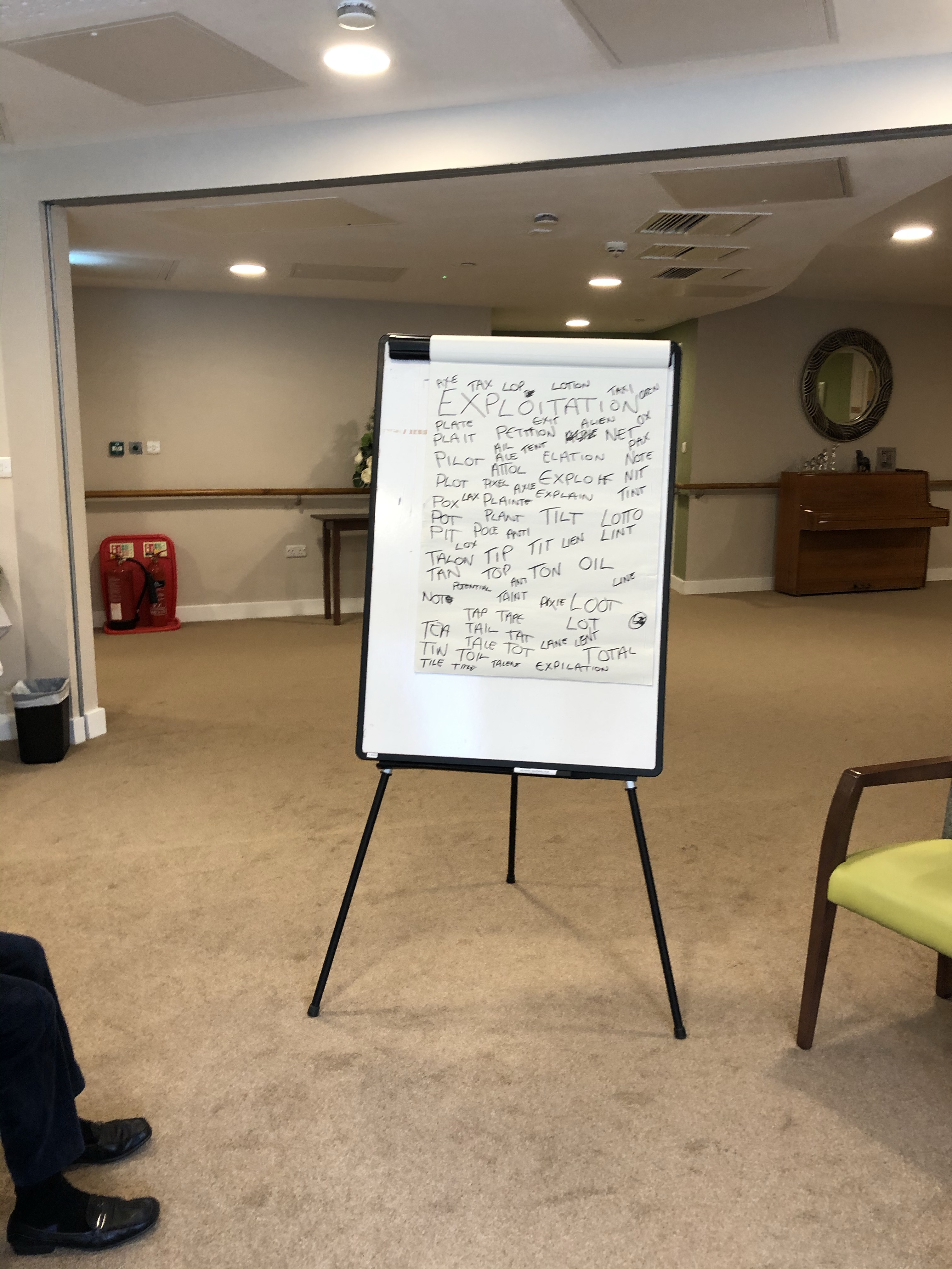 The Tuesday volunteer was sick today. The residents were disappointed so I stepped in to run the word game. I picked the word EXPLOITATION (maybe I was thinking of the Weinstein case) and the ladies had to make as many words as possible using the letters on the board.