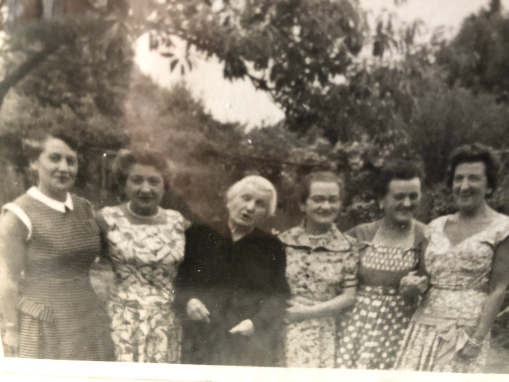 The sisters with their mother. Grandma Anne is holding her mother’s arm on the right and Auntie Minnie is at the end on the right