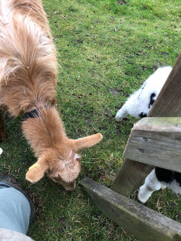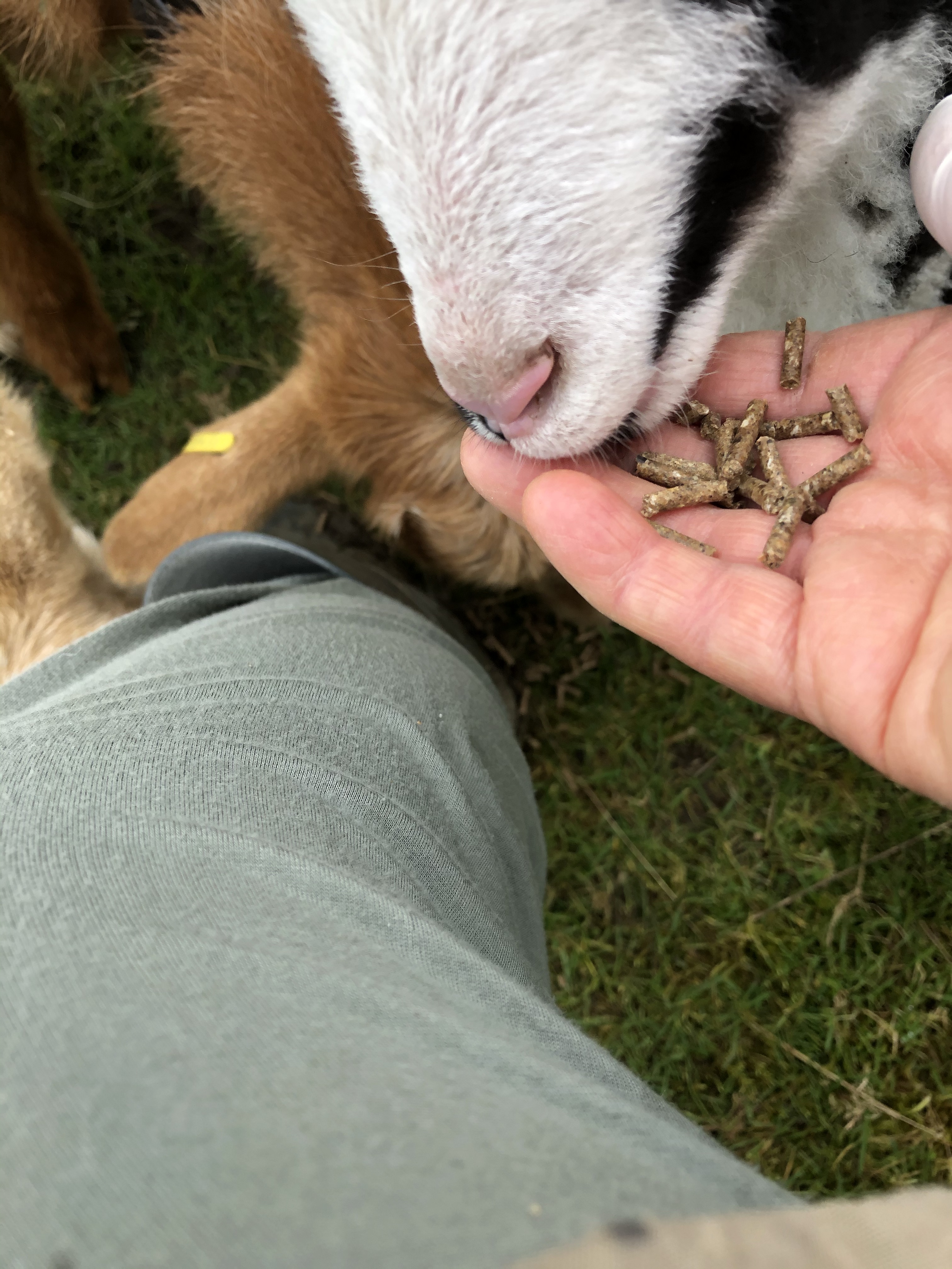 Unfortunately Helly only wants “milk” and doesn’t want to eat his solids. We will keep on trying. The goats hang around feasting on the food that drops onto the ground.