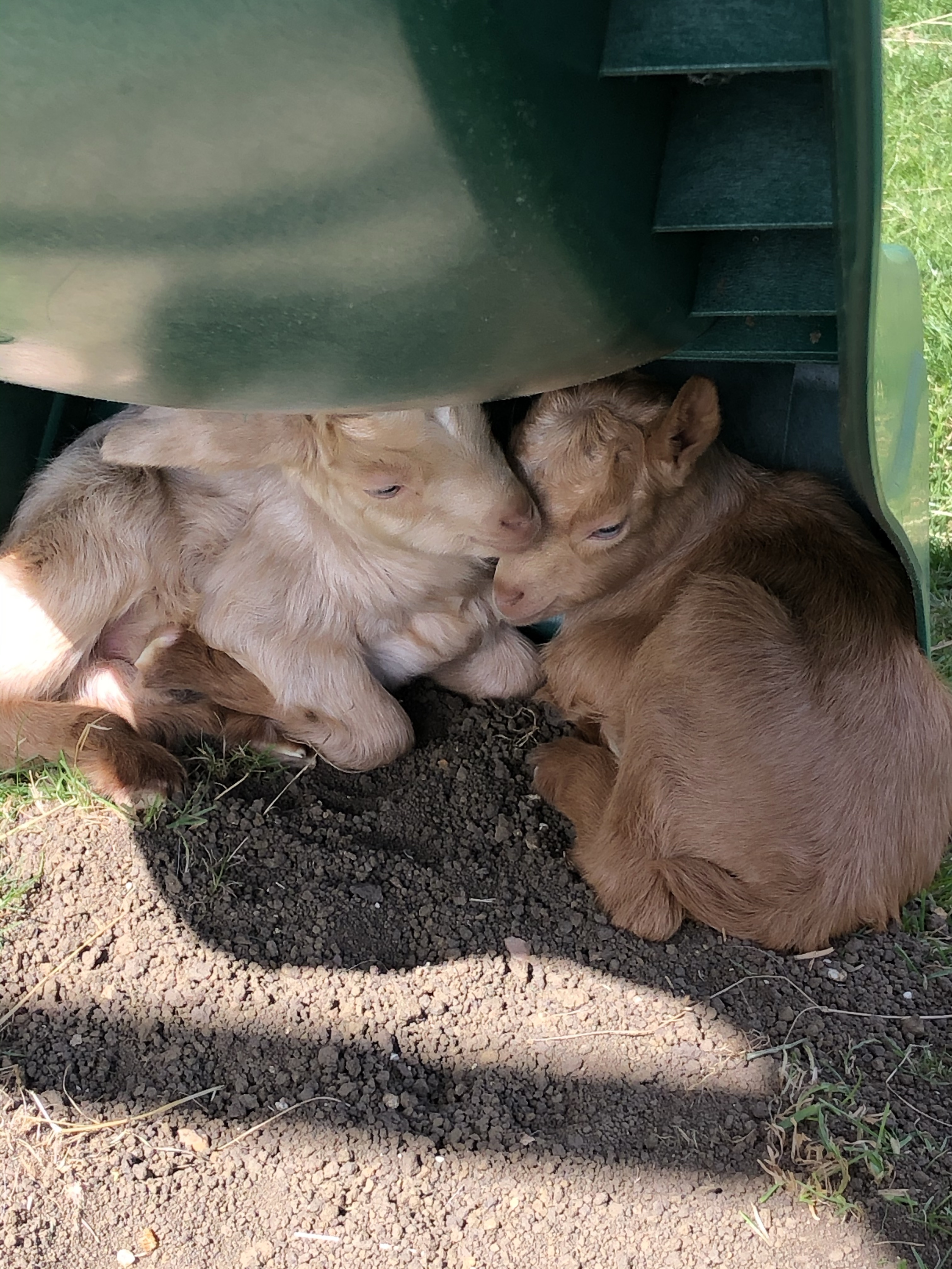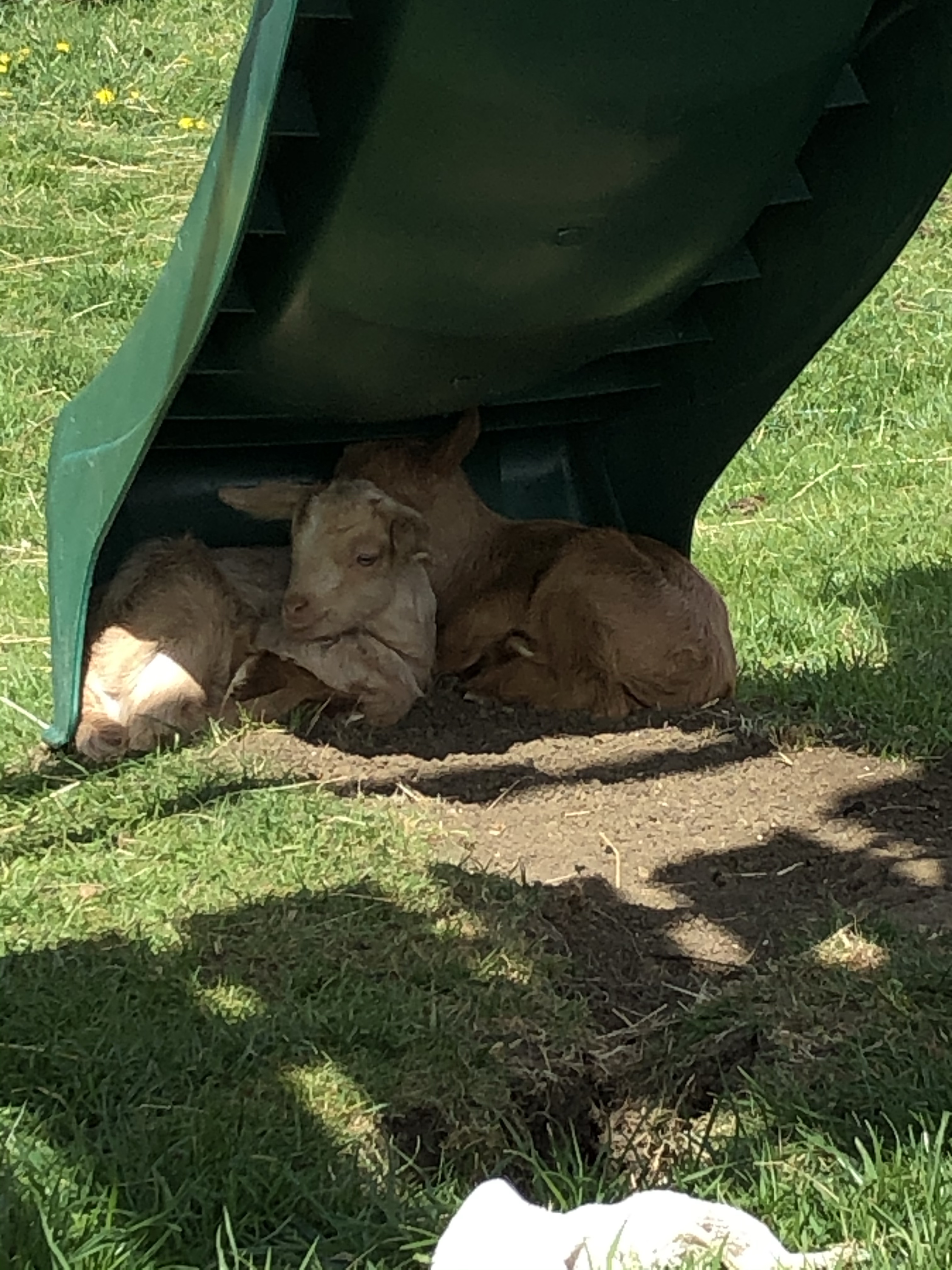 Willow and kids had been out all morning. Our neighbours had come to borrow a lawnmower (social distancing rules applied). Then I wanted to show them the kids but we couldn’t find them. I thought they had escaped but they had tucked themselves into the back of the slide under the climbing frame