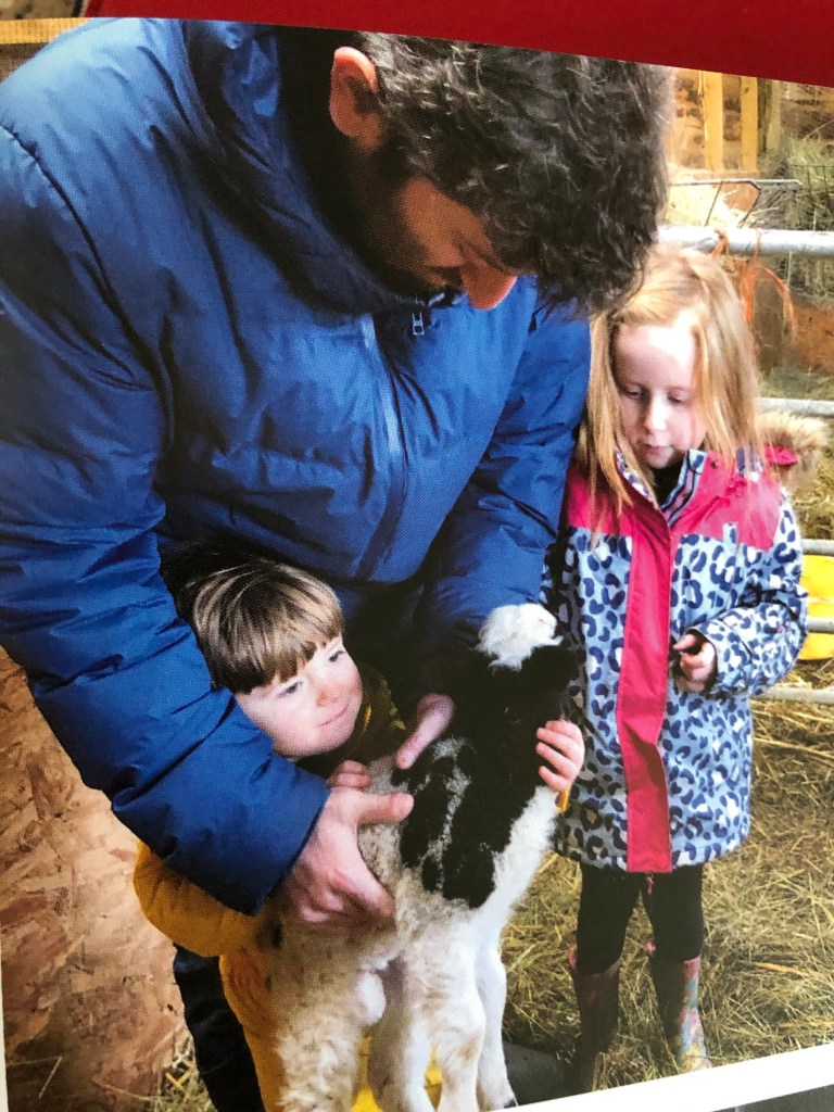In the lambing shed two months ago with his own children- and a lamb!