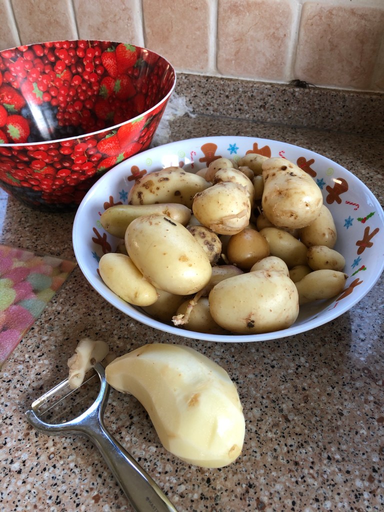 Yesterday evening Jeremy asked me to hand him a large bowl. “I’m collecting a surprise for you”. He returned with a bowl full of new potatoes – Sharps Express