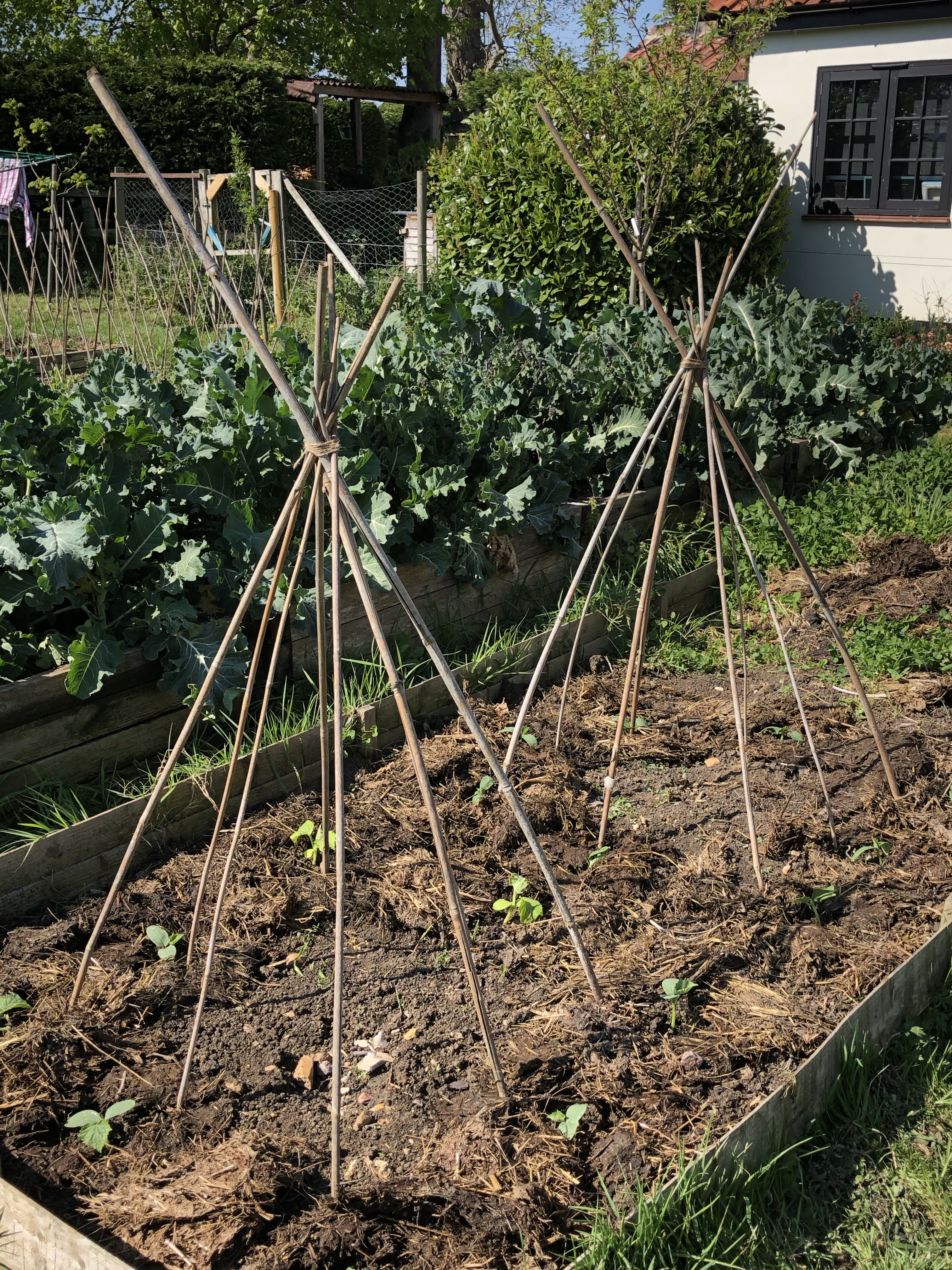 J has started to plant out cucumbers around a wigwam of canes. The plants started as seeds in the house and then hardened off in the greenhouse and are now outside. I can practically taste the pickles!