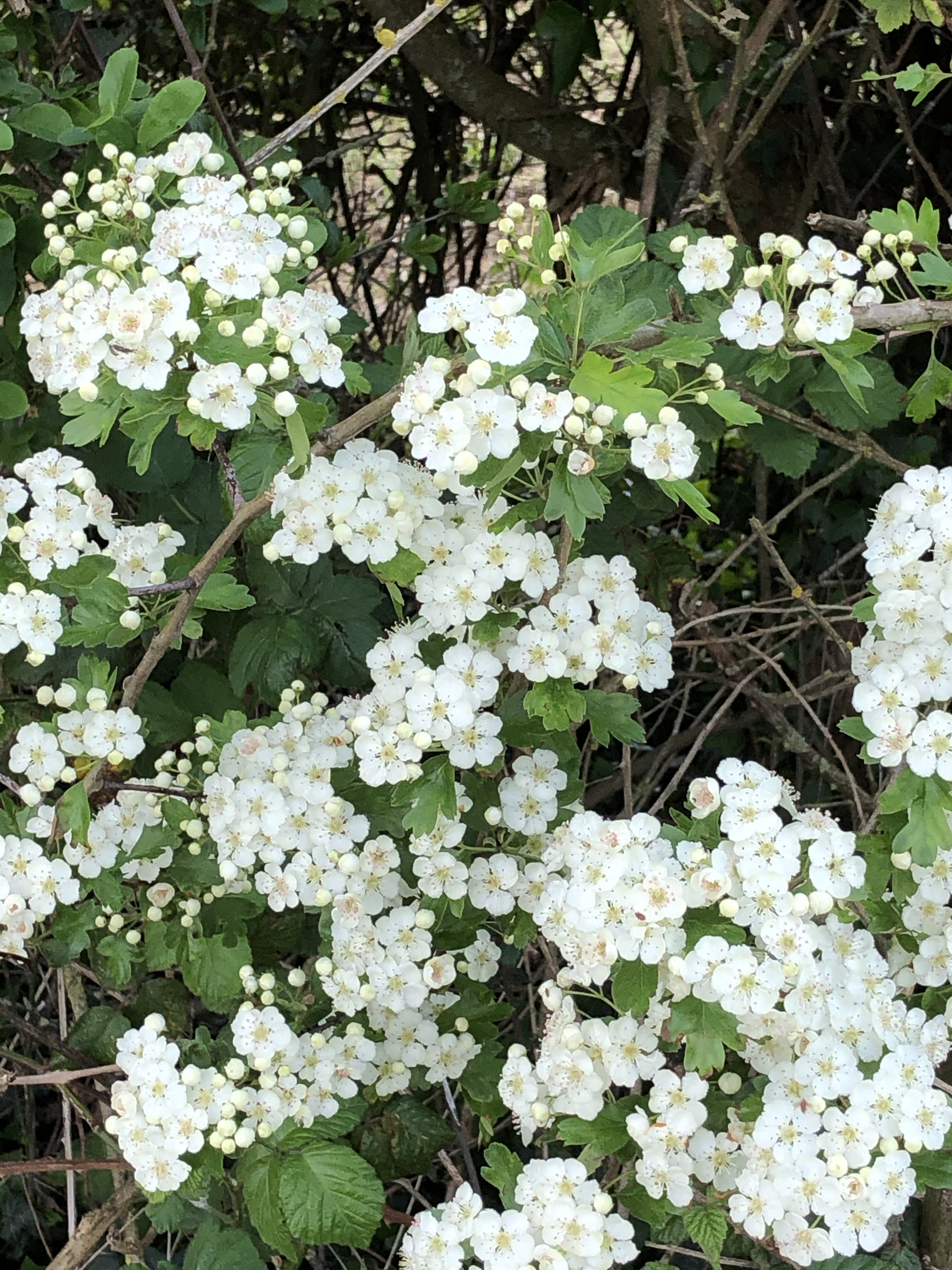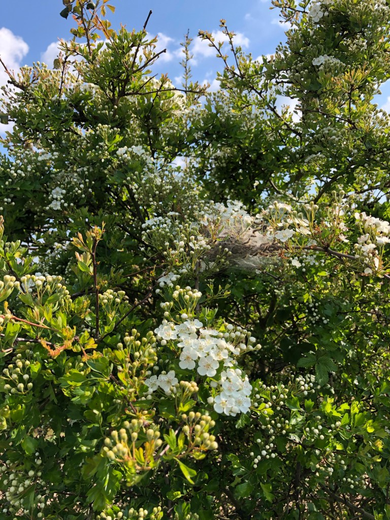 The hedges are white with common hawthorn blossom