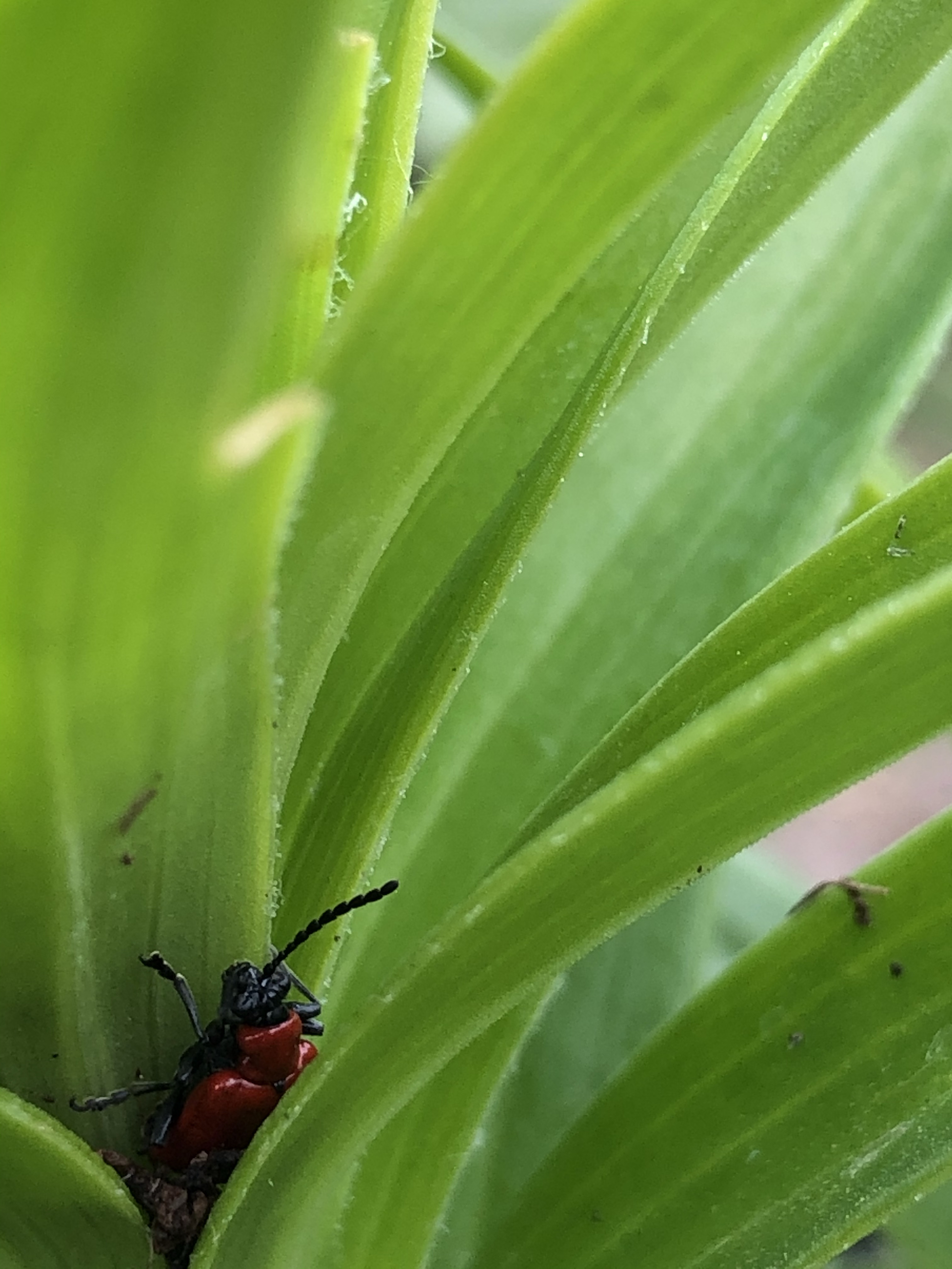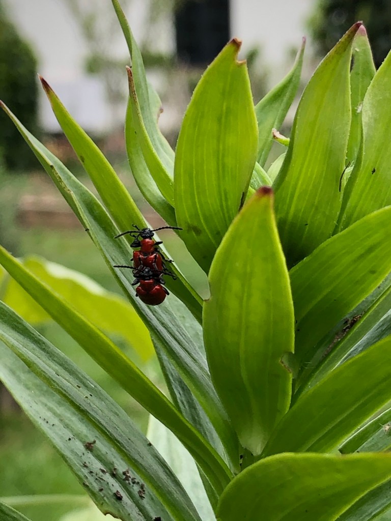 They are plagued by the annual visits of the red Lily beetles – which overwinter in the soil, anywhere, and somehow find their way to the lily plants where they mate and lay their eggs. They are such prettily coloured beetles and they can only live on lilies but they nibble holes in the Lily leaves which can be irksome. I am prepared to live with the beetles as long as they don’t interfere with the Lily flowers. I certainly wouldn’t use a pesticide. Live and let live.