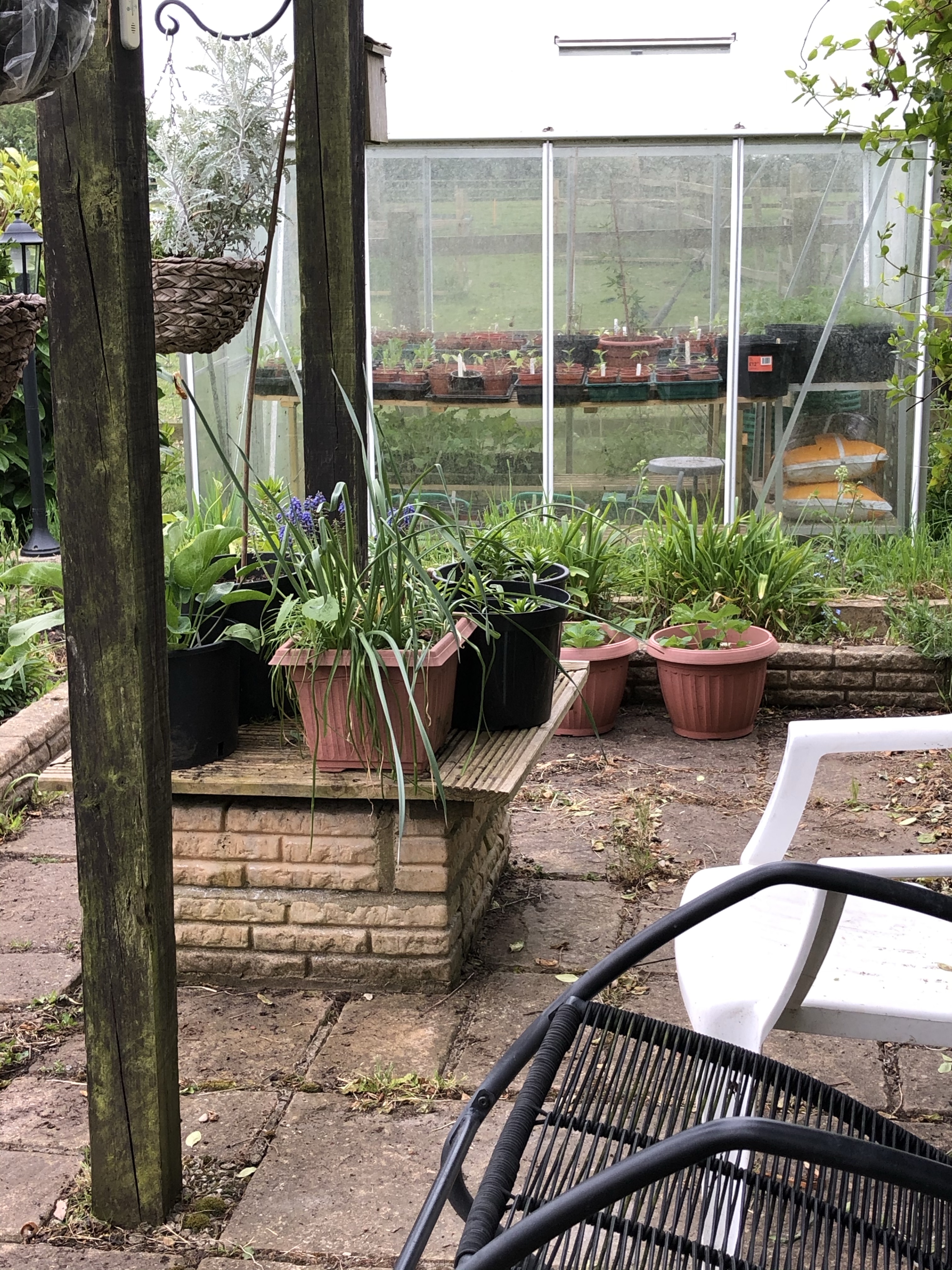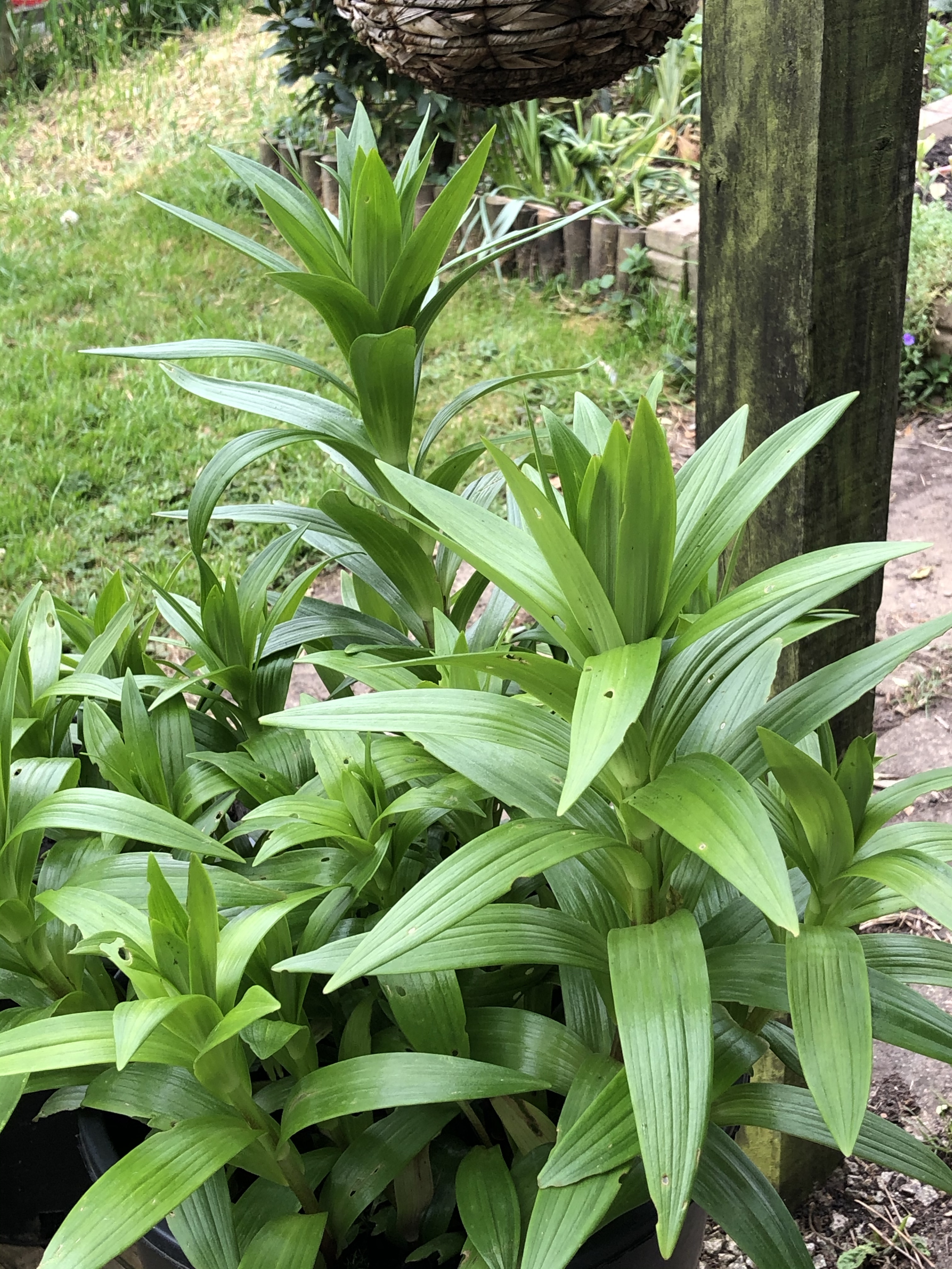 The “Poundland” lilies have done so well and J divided up the pot (which had become overcrowded) and overwintered them in the poly tunnel. We now have four pots of vigorous lilies under the pergola