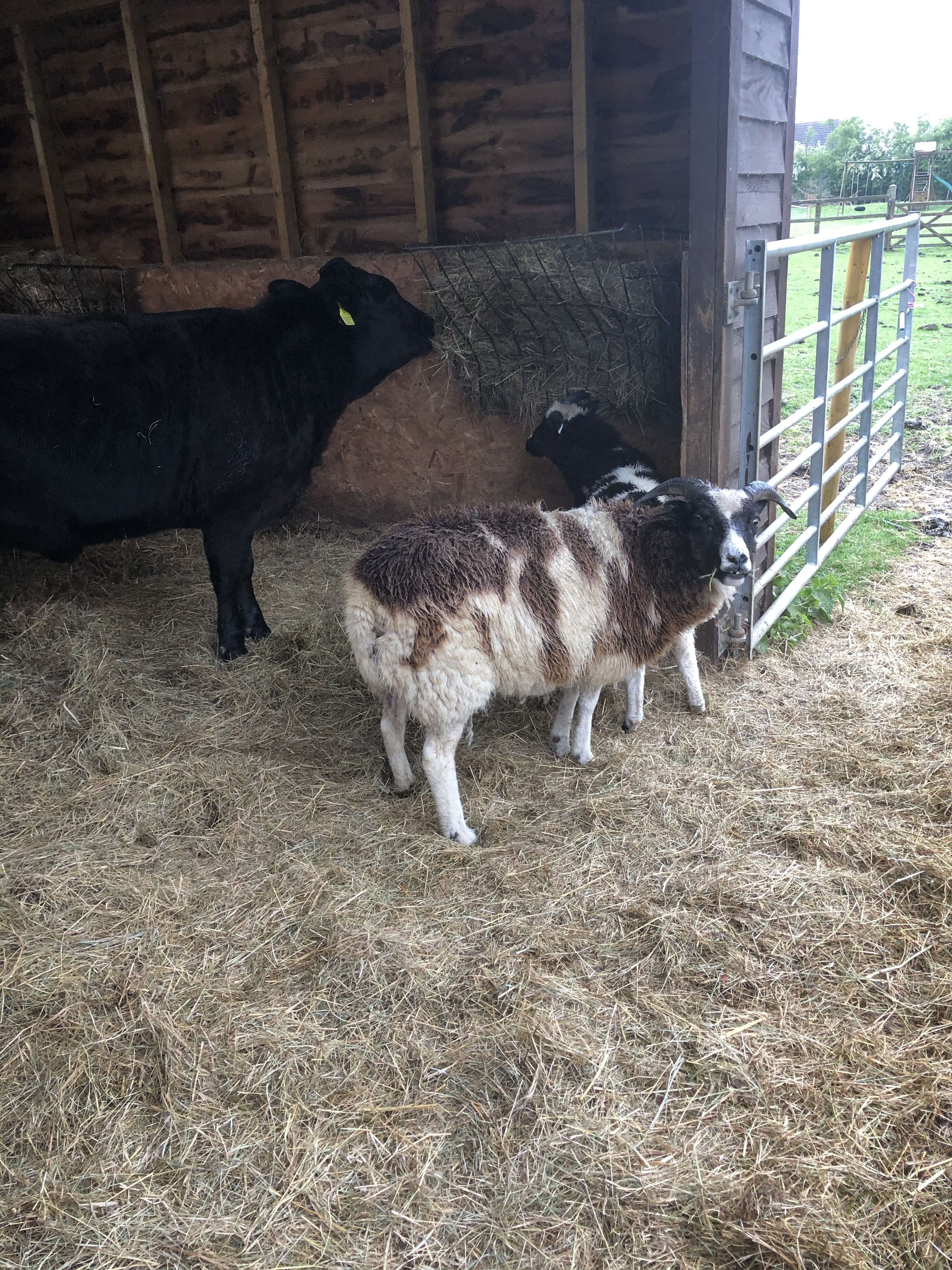 One of the lambs is unaware that the cows are “top dogs” at The Gables. The lamb was happily eating from the cow hay and getting away with it!