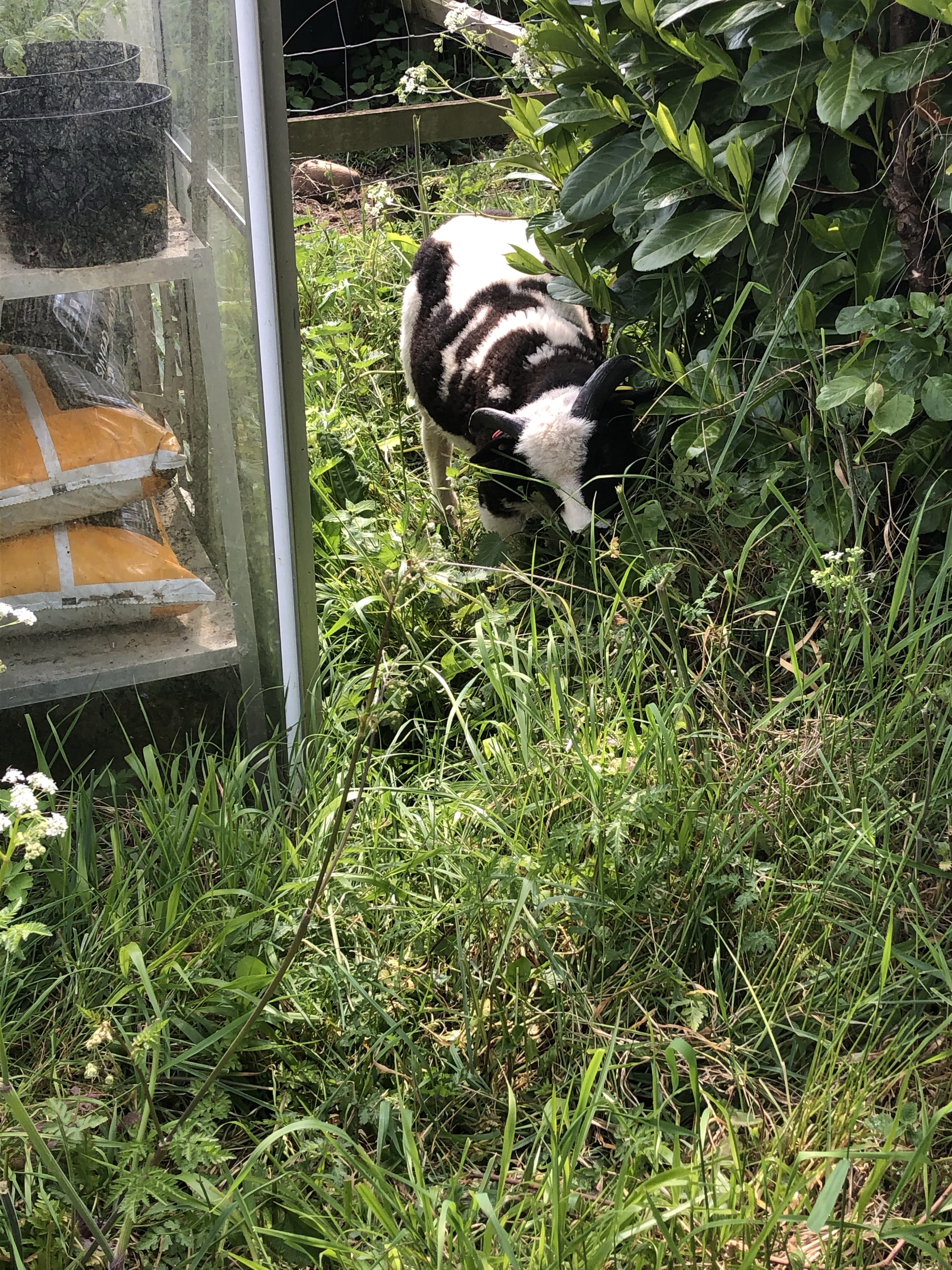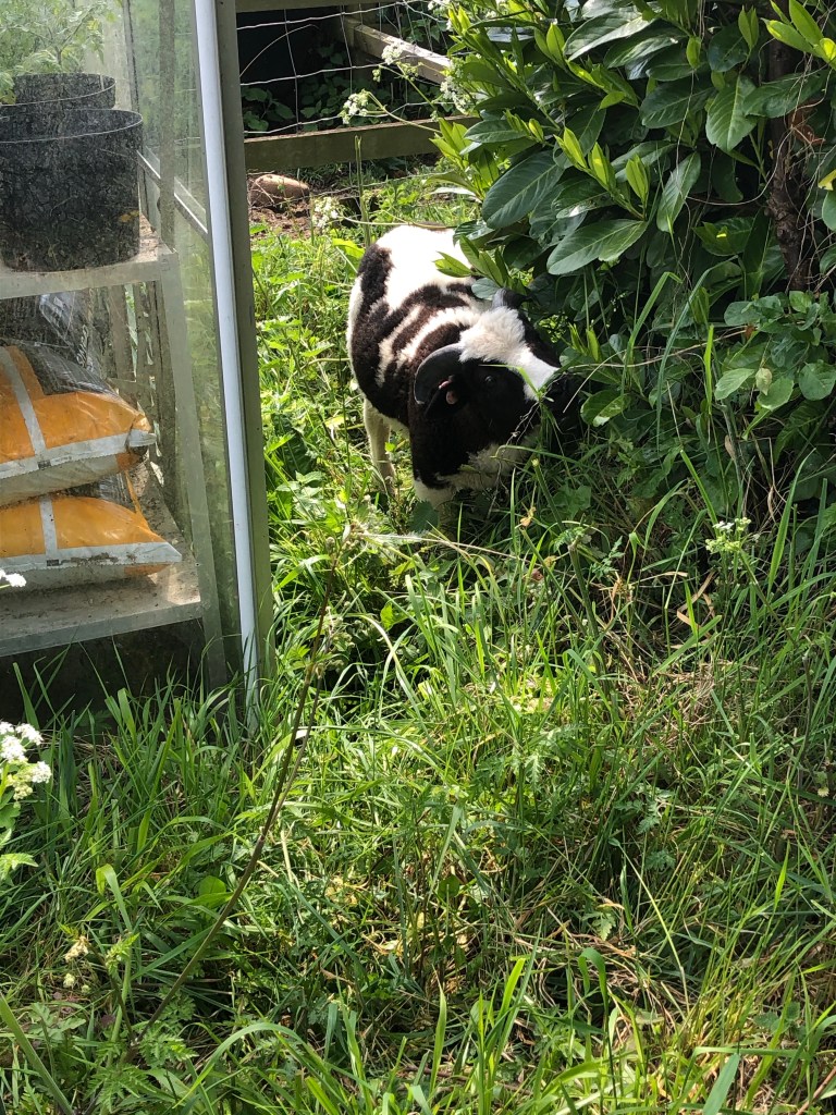 Give a lamb a gap and it will get through. Helly found a gap in the fence and, as we were sitting having a cuppa under the pergola, he appeared around the side of the greenhouse