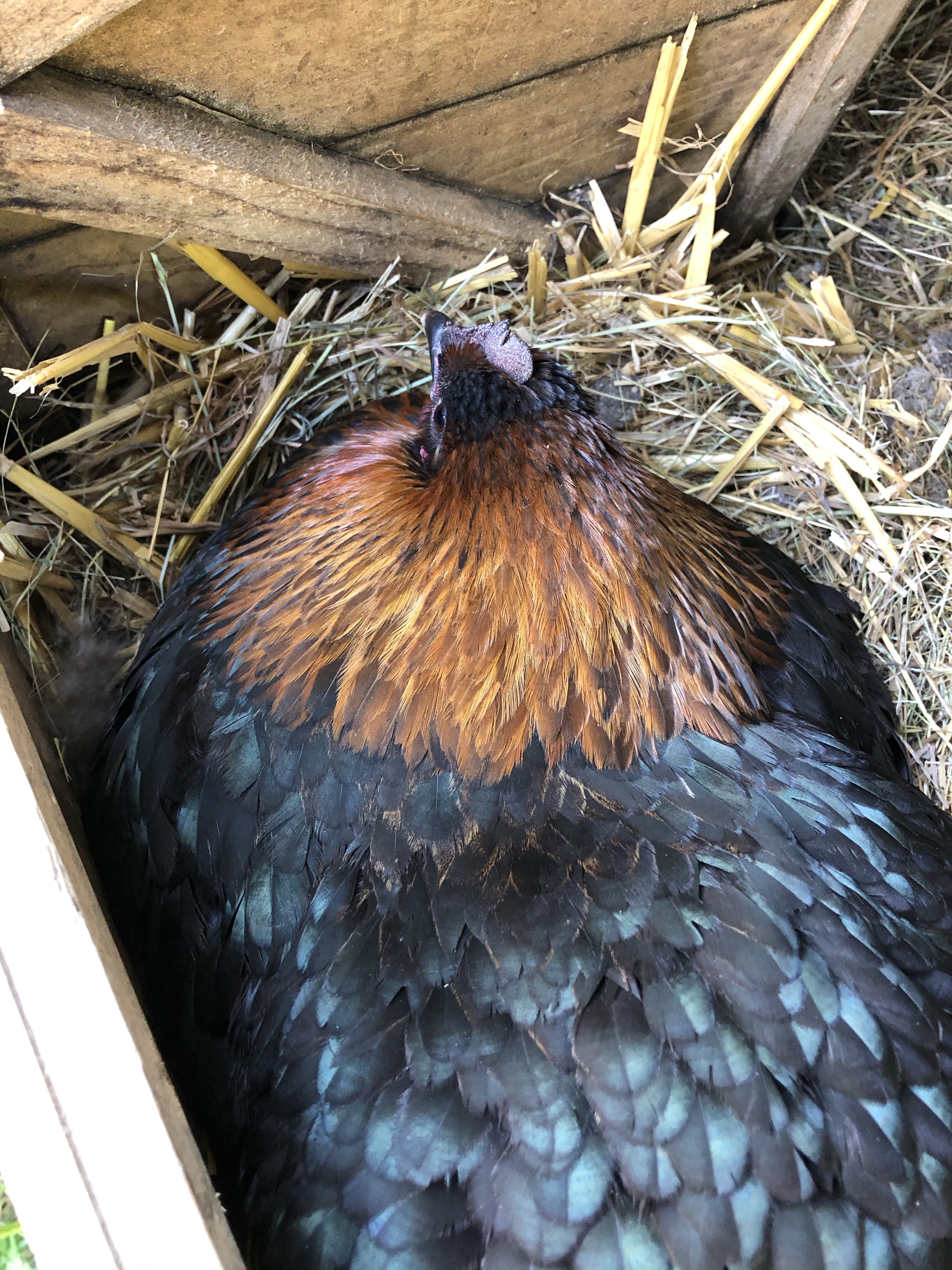 Then I went to check on one of the Pom Pom girls who went broody a few days ago. She is now sitting on three GOOSE eggs, bless her.