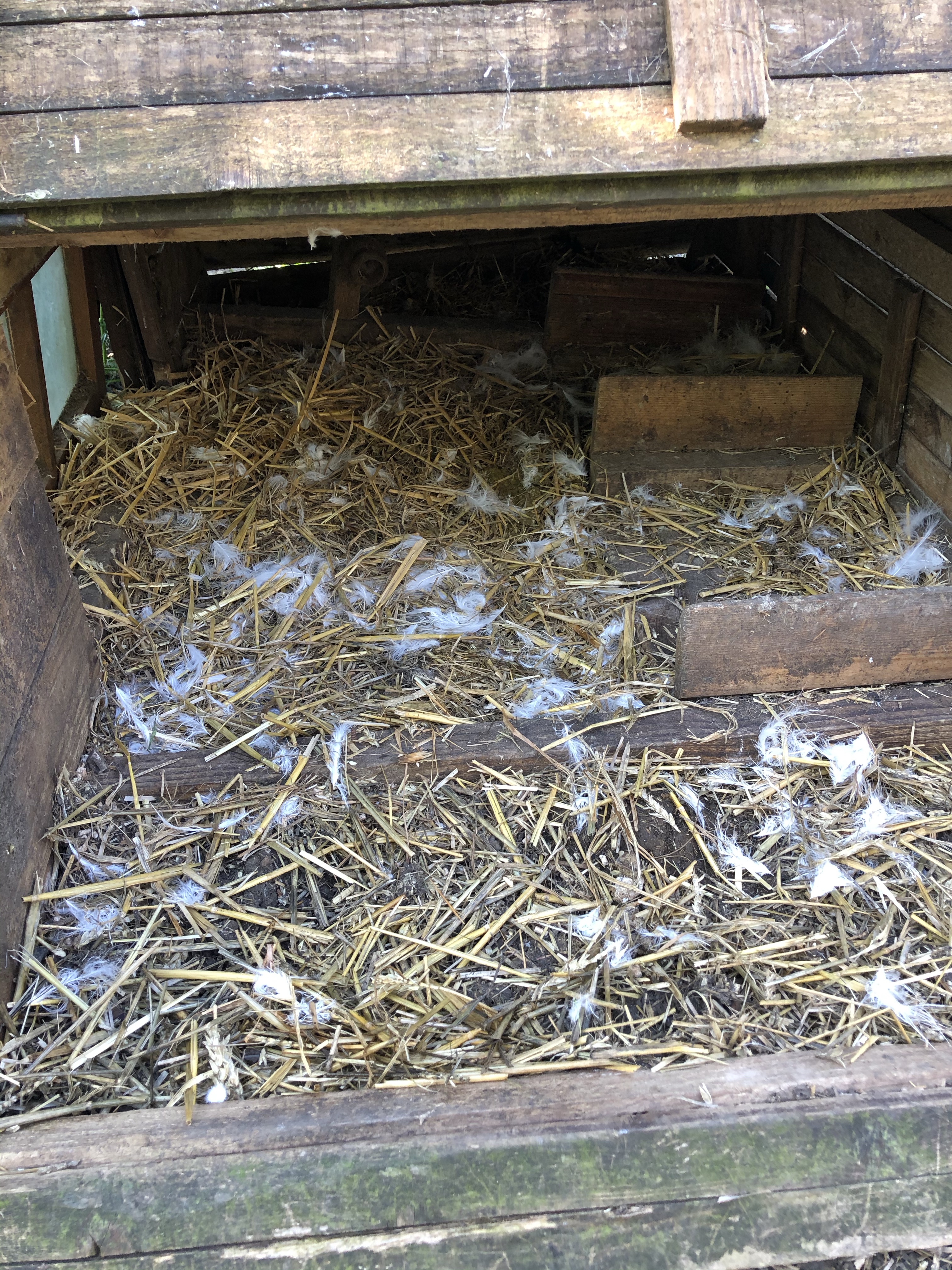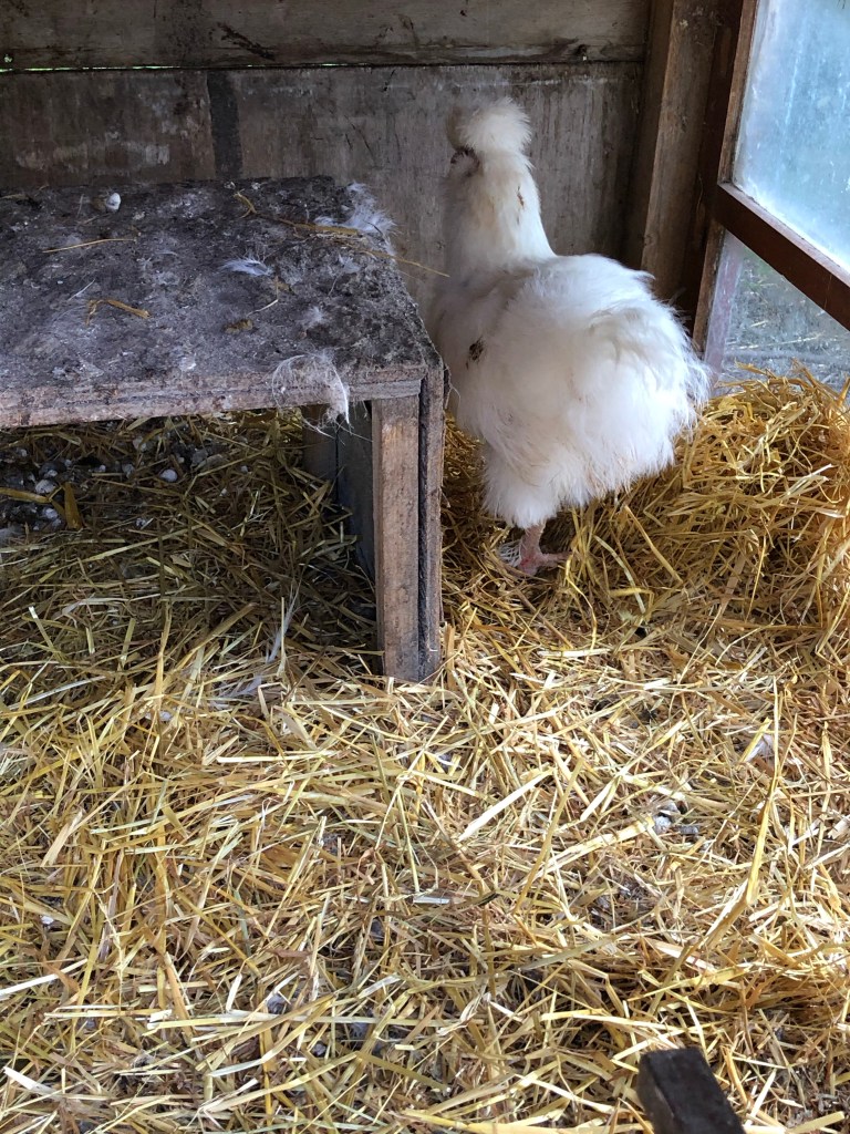 Then it was time to check on the other Mrs Silkie who has been sitting in the ark on 8 eggs for two and a half weeks. When I opened the ark door Mrs Silkie was off her nest, her food containers were upended and there were white,Silkie feathers everywhere.