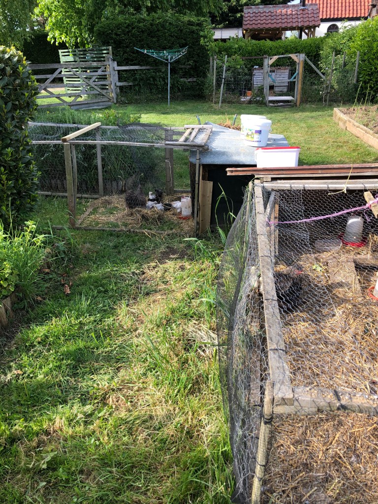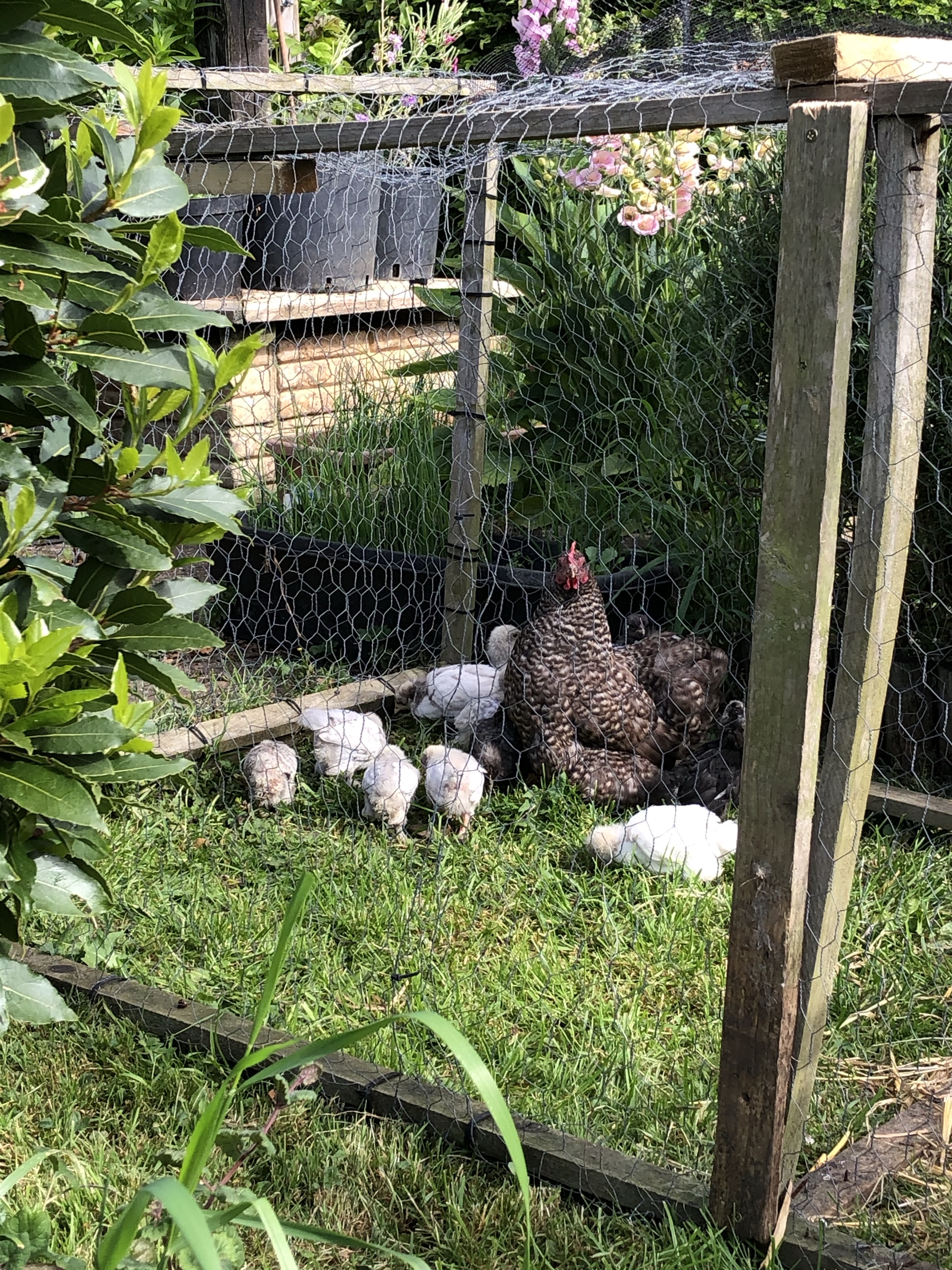 The other hen and her four chicks are enjoying the space but not sure about the neighbours