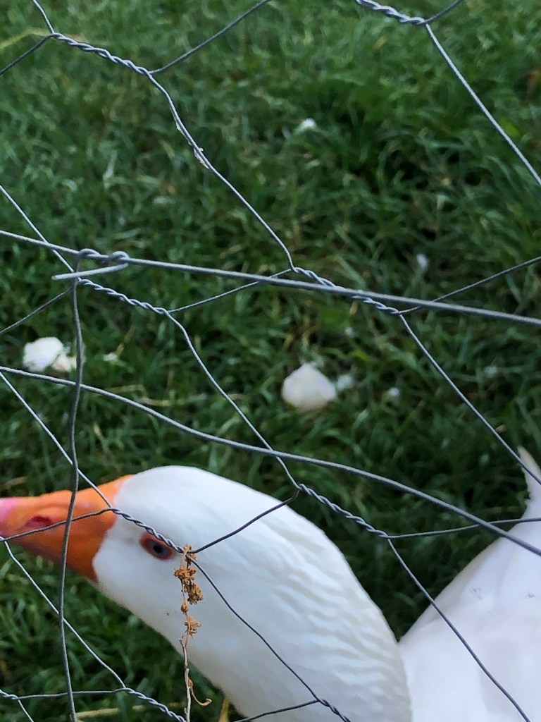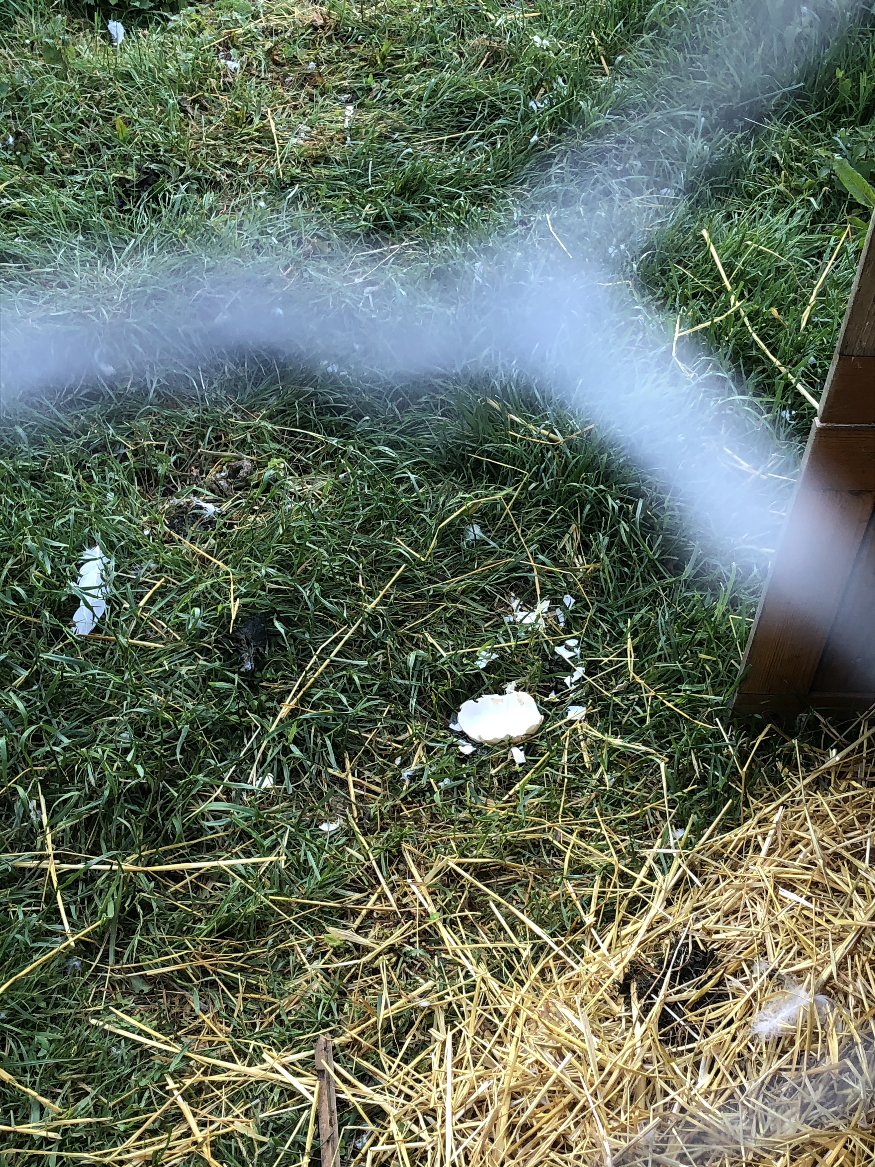 After two weeks of egg laying and intermittent sitting, the geese let their guards down. This morning I saw two broken eggs – shells on the grass and contents gone, every trace.