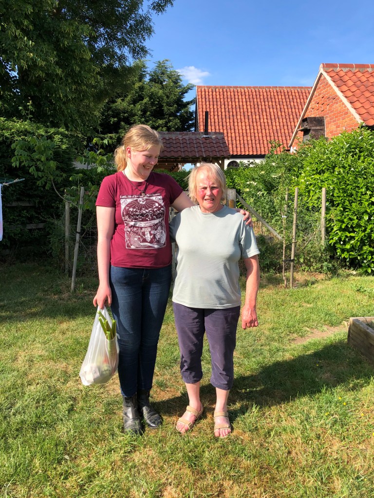 A socially distanced visit, this afternoon, from our friend and her wonderfully tall granddaughter (not yet 13). They came to see the goat kids and we were pleased to send them home with a bag of rhubarb, artichokes and eggs.