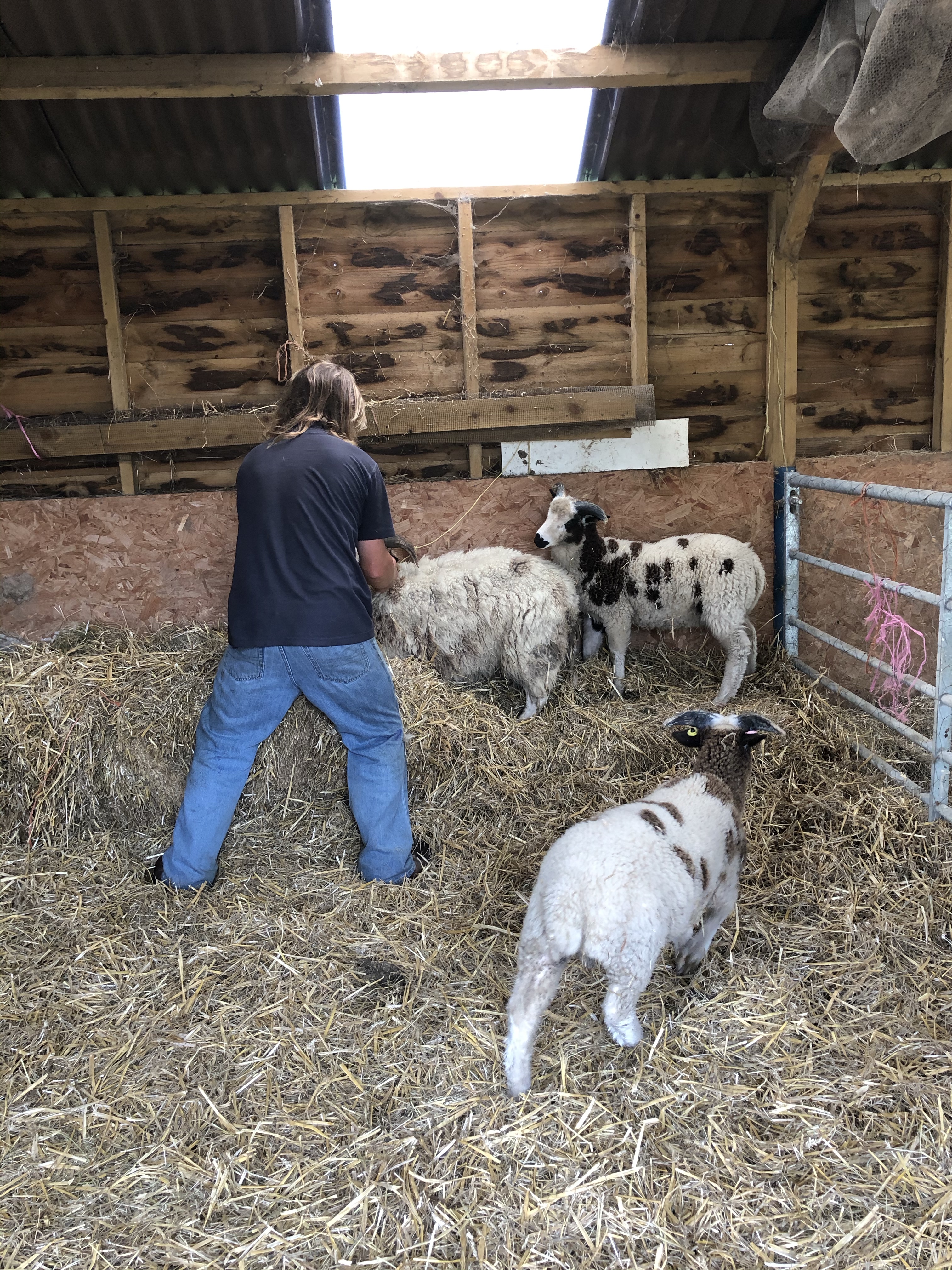 I tied the fleeces and then took over from Jeremy so that I held the sheep whilst Rob sheared. My tying was a bit of a disaster so Jeremy re-rolled and tied them and stored them in the paddock barn. Click below
