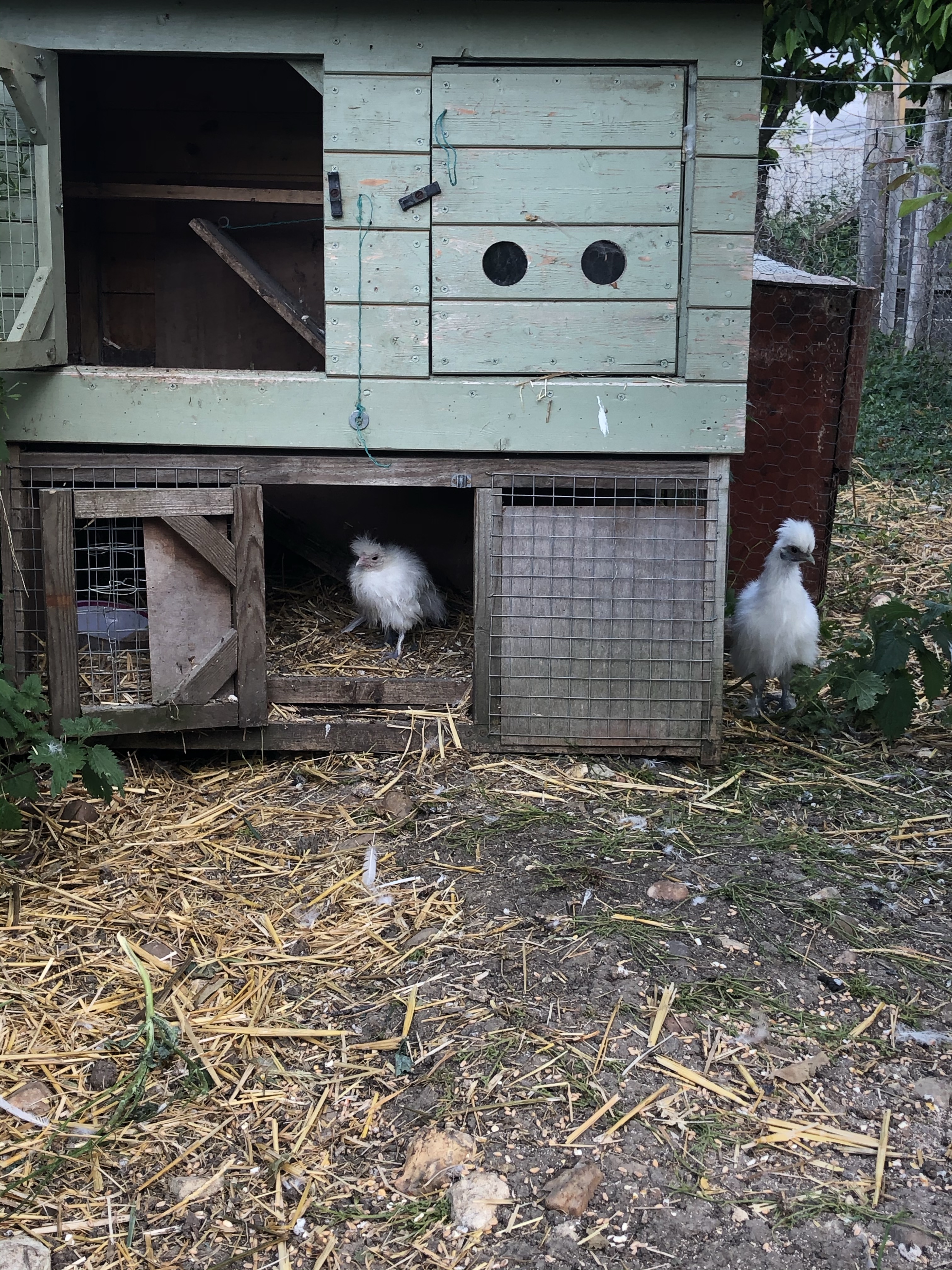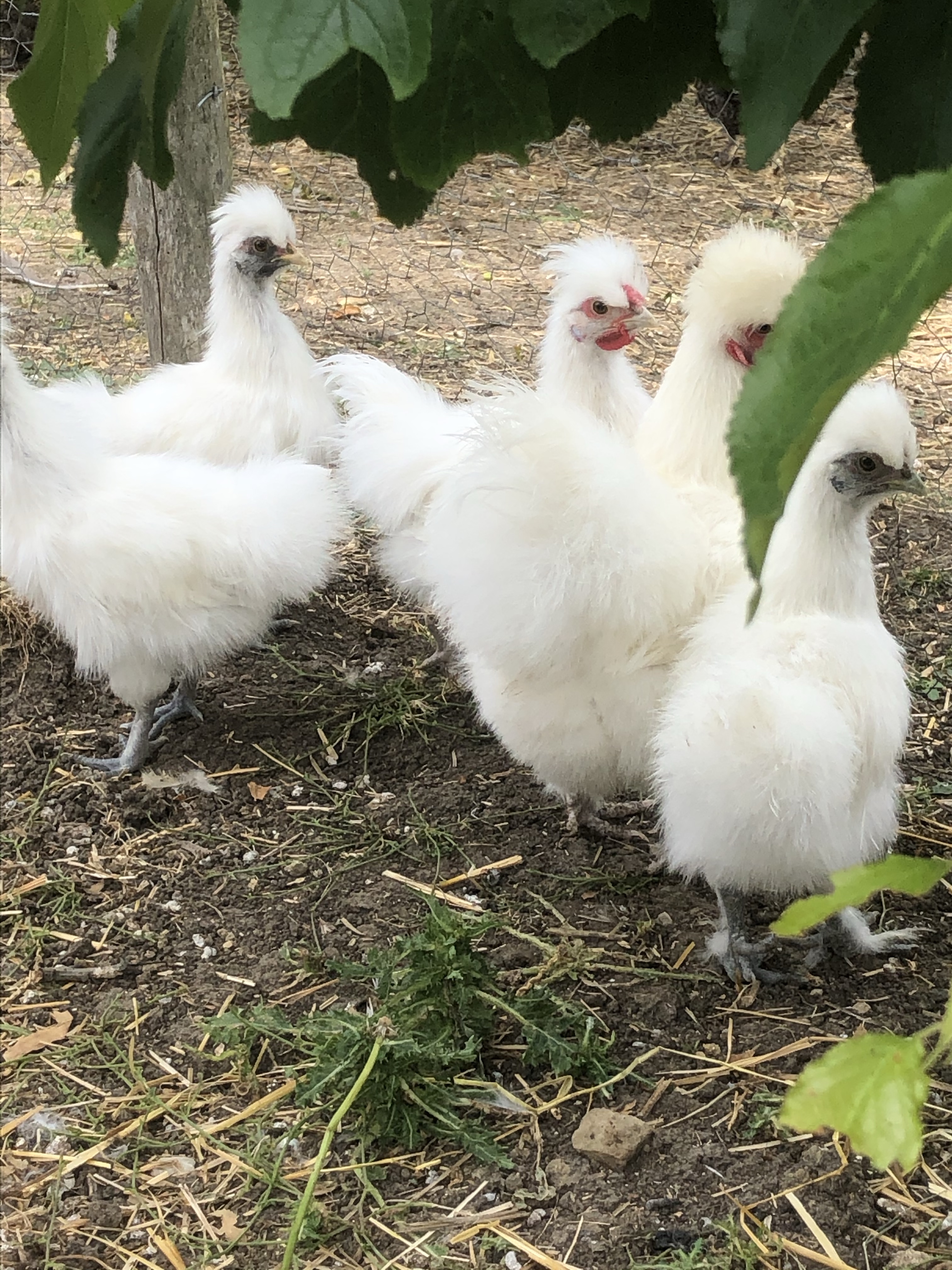 Mrs Silkie is a great mother hen and hatched six chicks a few weeks ago. Five of them are now nearly as big as mother