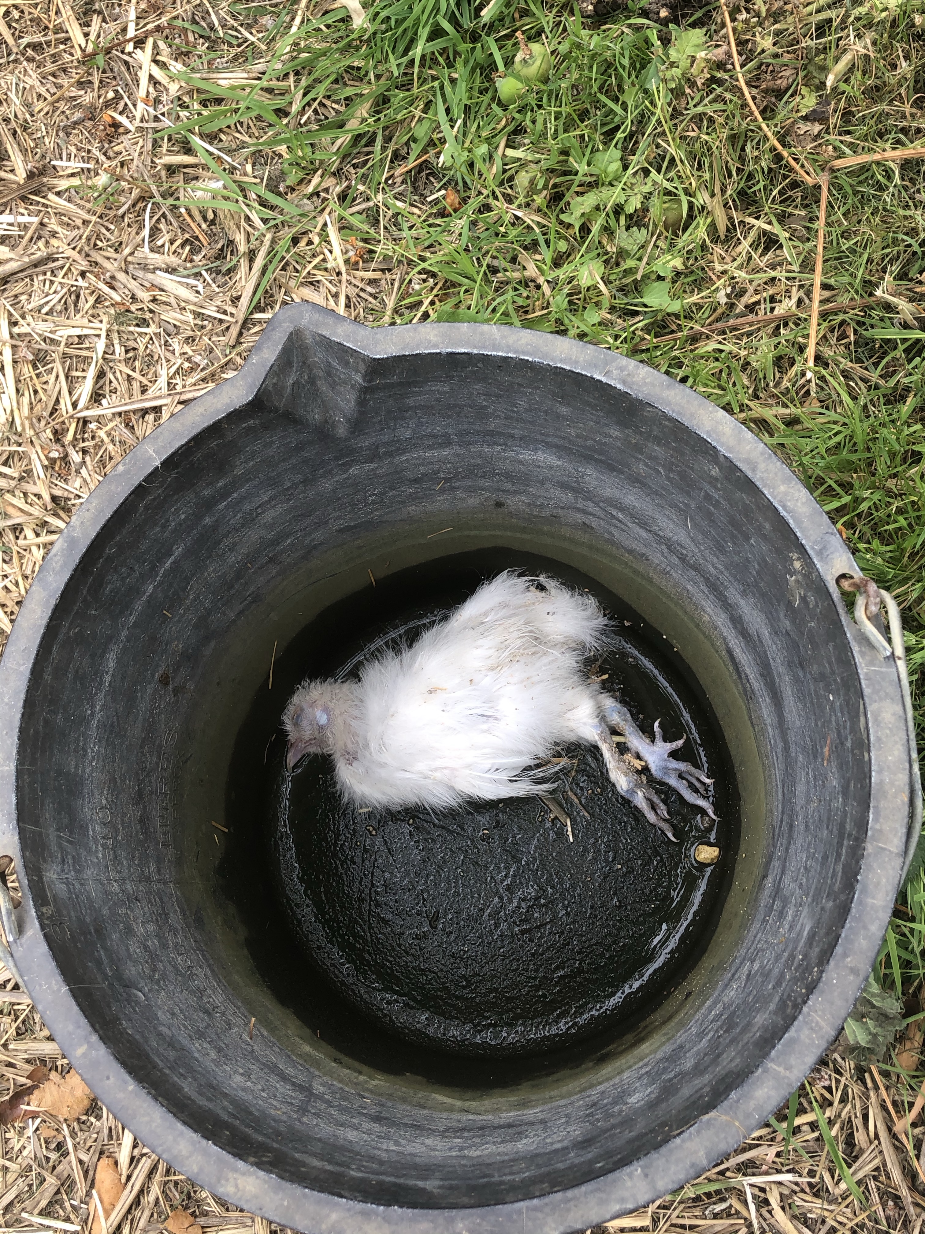 This morning, when I opened up the hen house, I found the little bird dead. I picked it up, put it in a bucket and brought it back outside the kitchen door