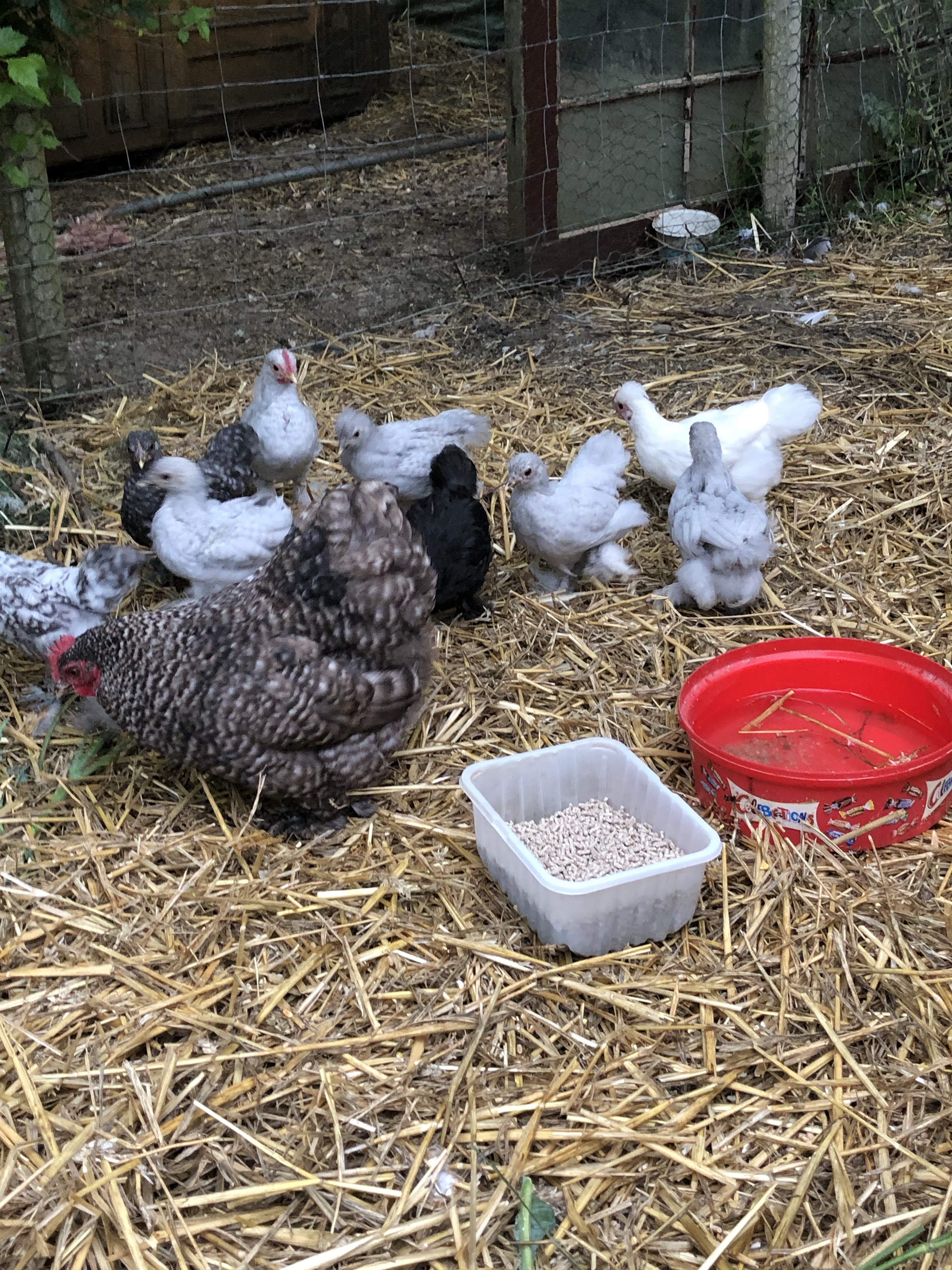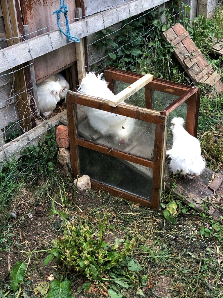 I lifted the hatch of the new Silkie house and the first chook to emerge, albeit very slowly and cautiously, was the unencumbered Silkie Hen. Then two adult cockerels followed her