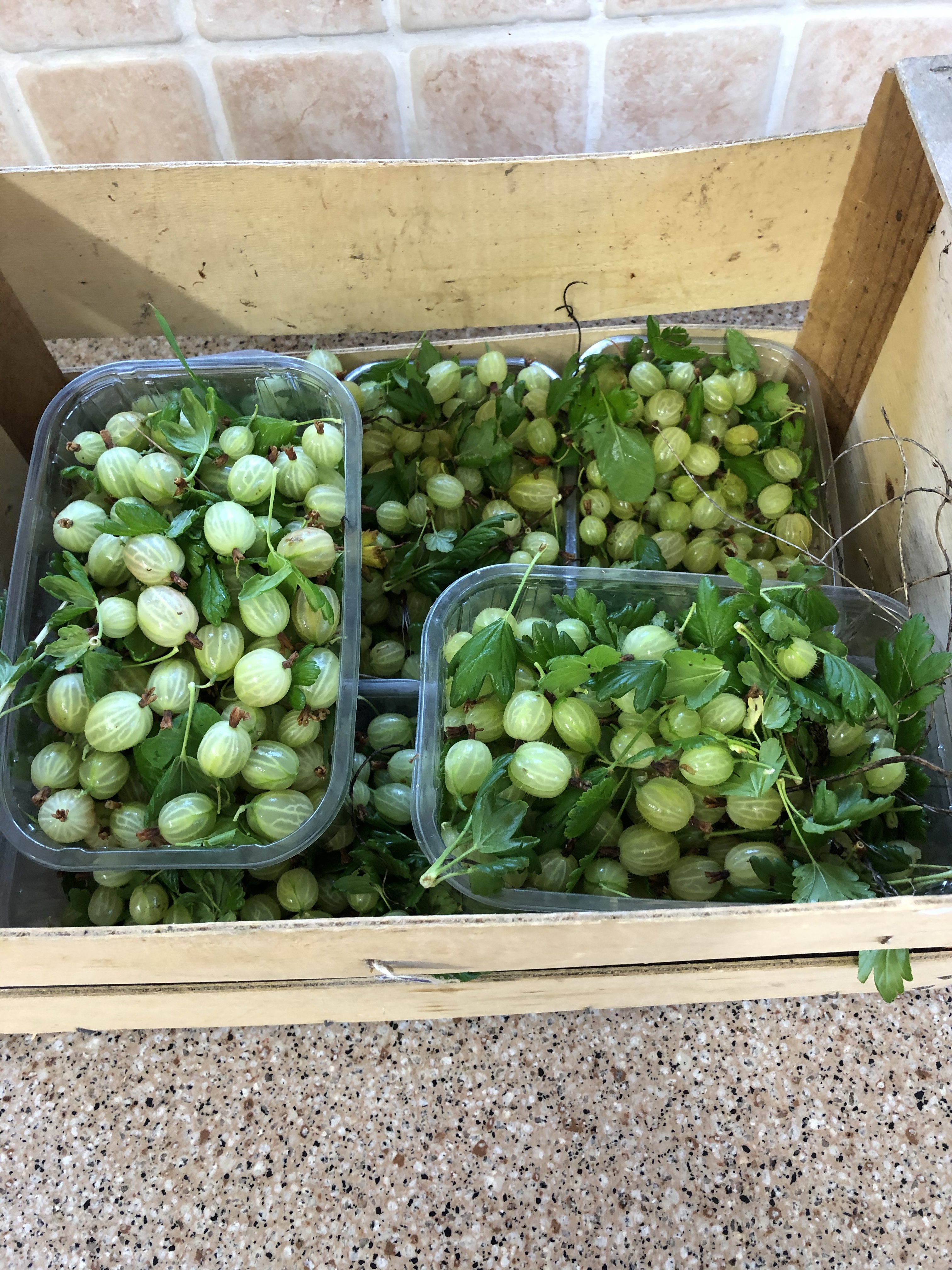 I got up with the lark – well more like the cuckoo, who taunts with his song day and night but refuses to let me see him. I picked six punnets of gooseberries