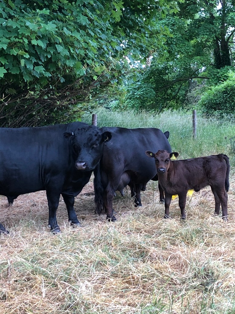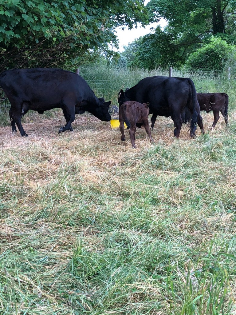 Kate has taken two more cows and calves to join Lucy and Lily and Sammi in the field in the village. One of the cows is Lucy’s niece Bella (since renamed Parsley when we sold her to Kate).