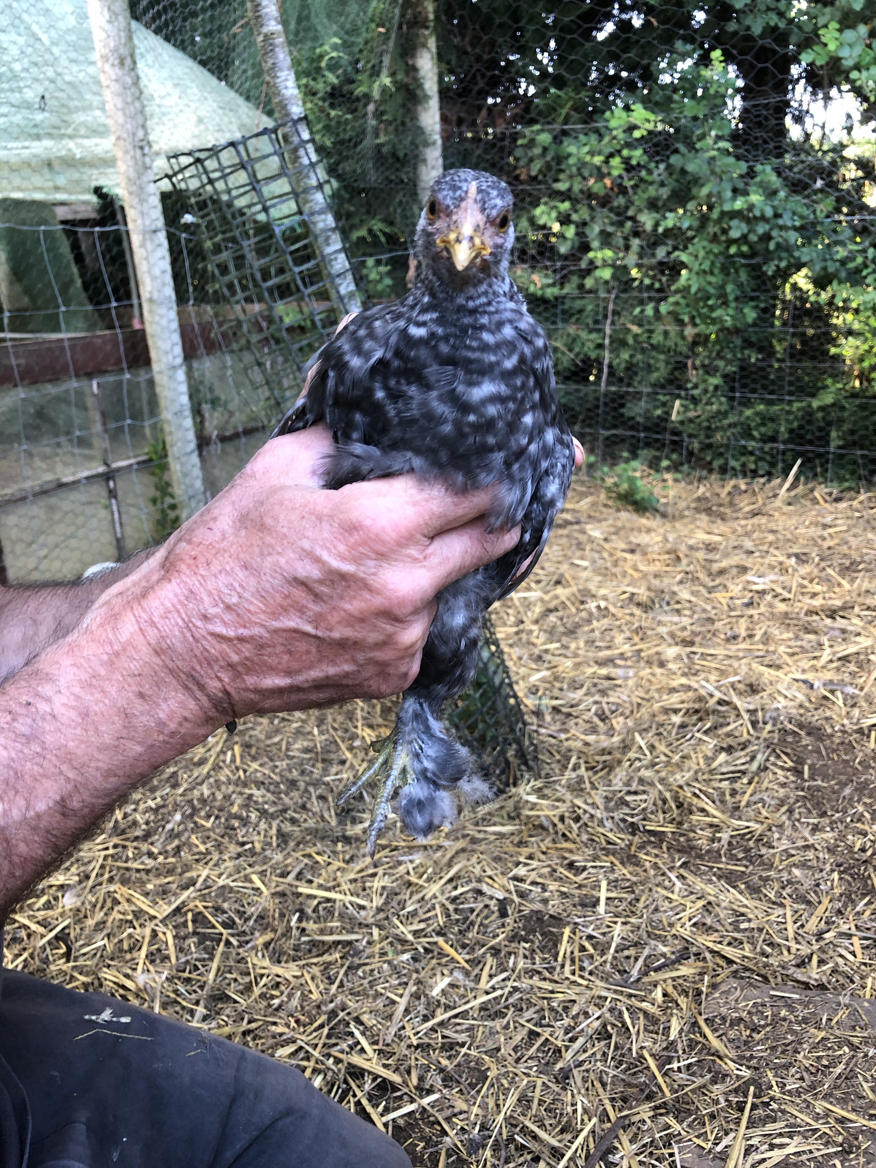 This little one hid under the hen house until we flushed her out and caught her – naughty chick – but quite cute looking and very soft!