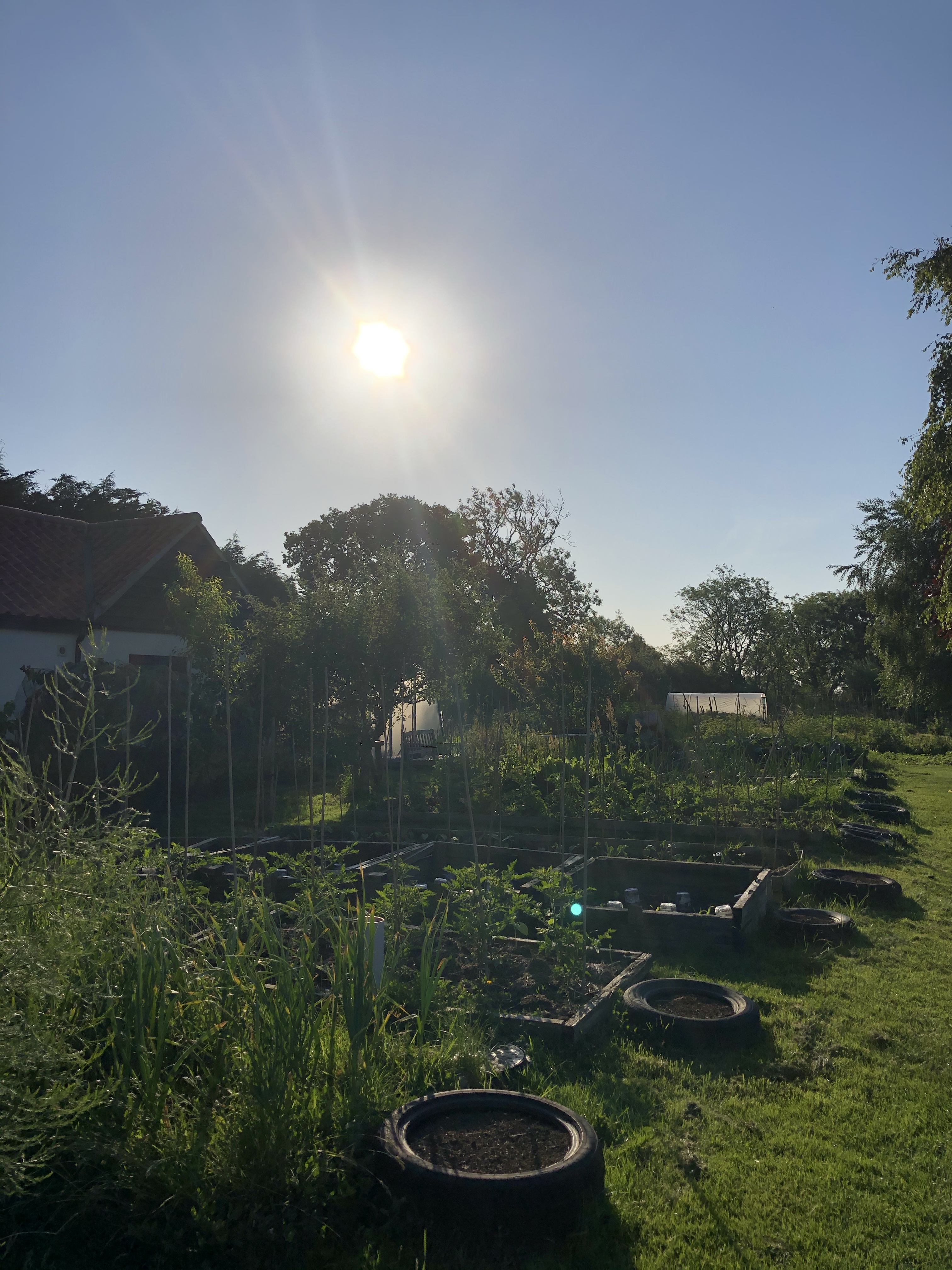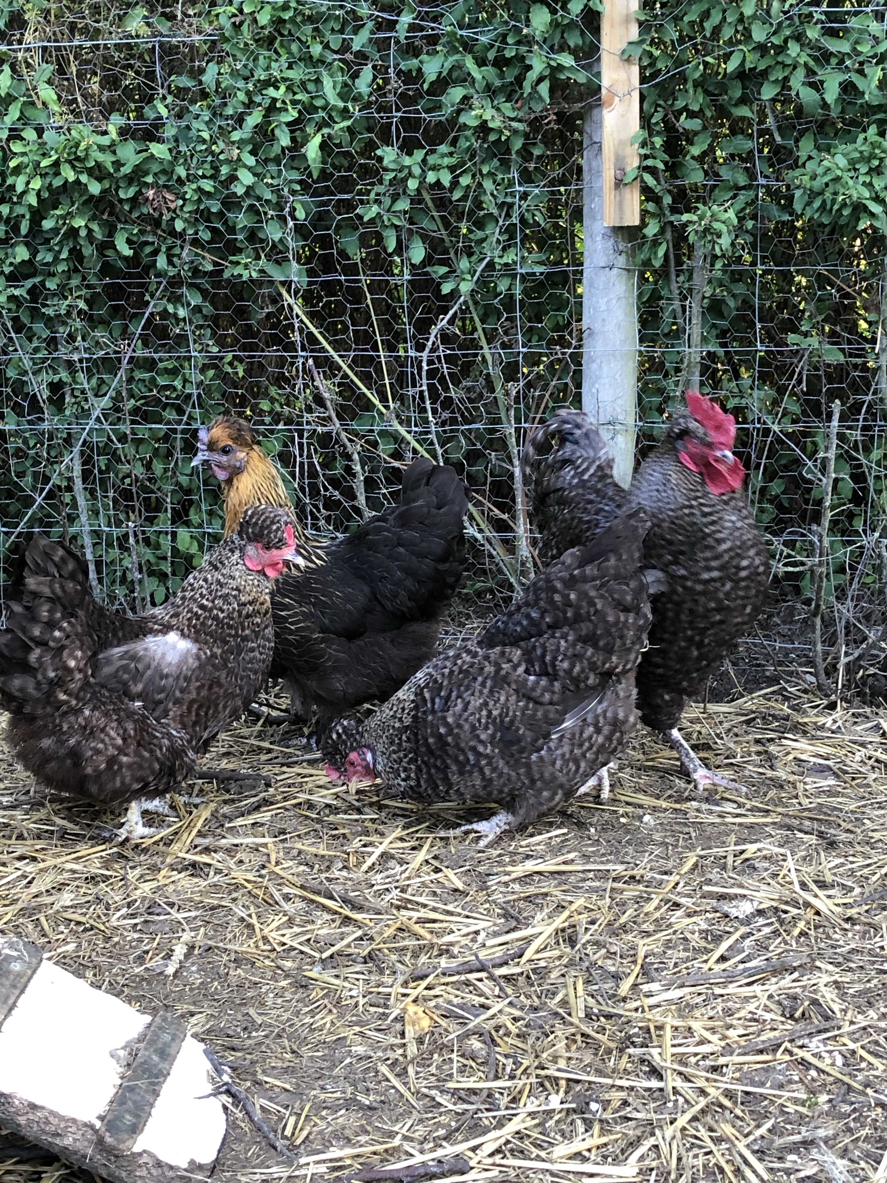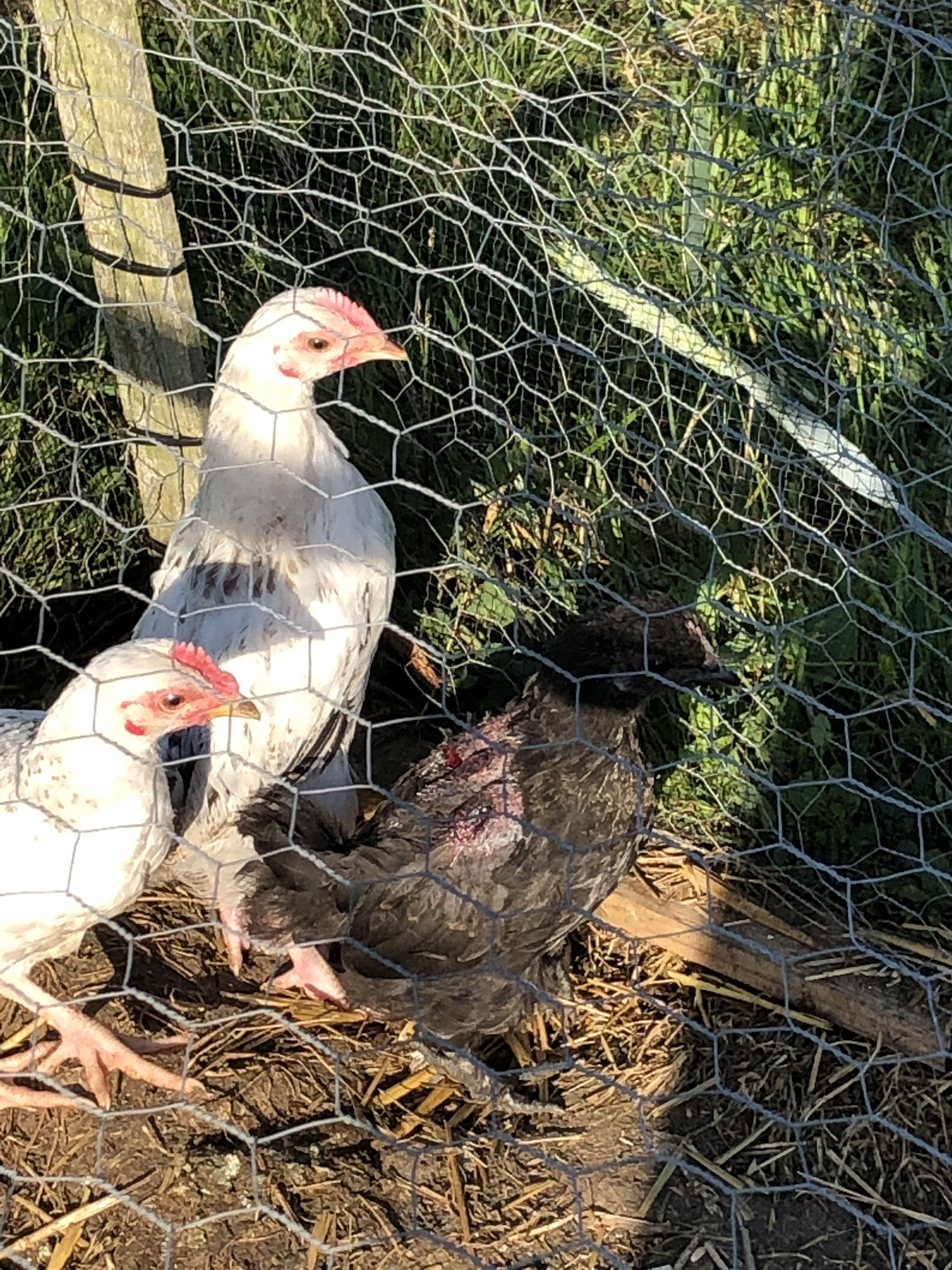 There’s been some trouble with one mother hen and the three chicks. Mother hen has started laying again, the chicks are quite big now and Mother has took against the black chick. Yesterday Jeremy saw her pecking the little one, this morning his back has two non accidental injury marks. Jeremy has moved Mother back to her original flock. We