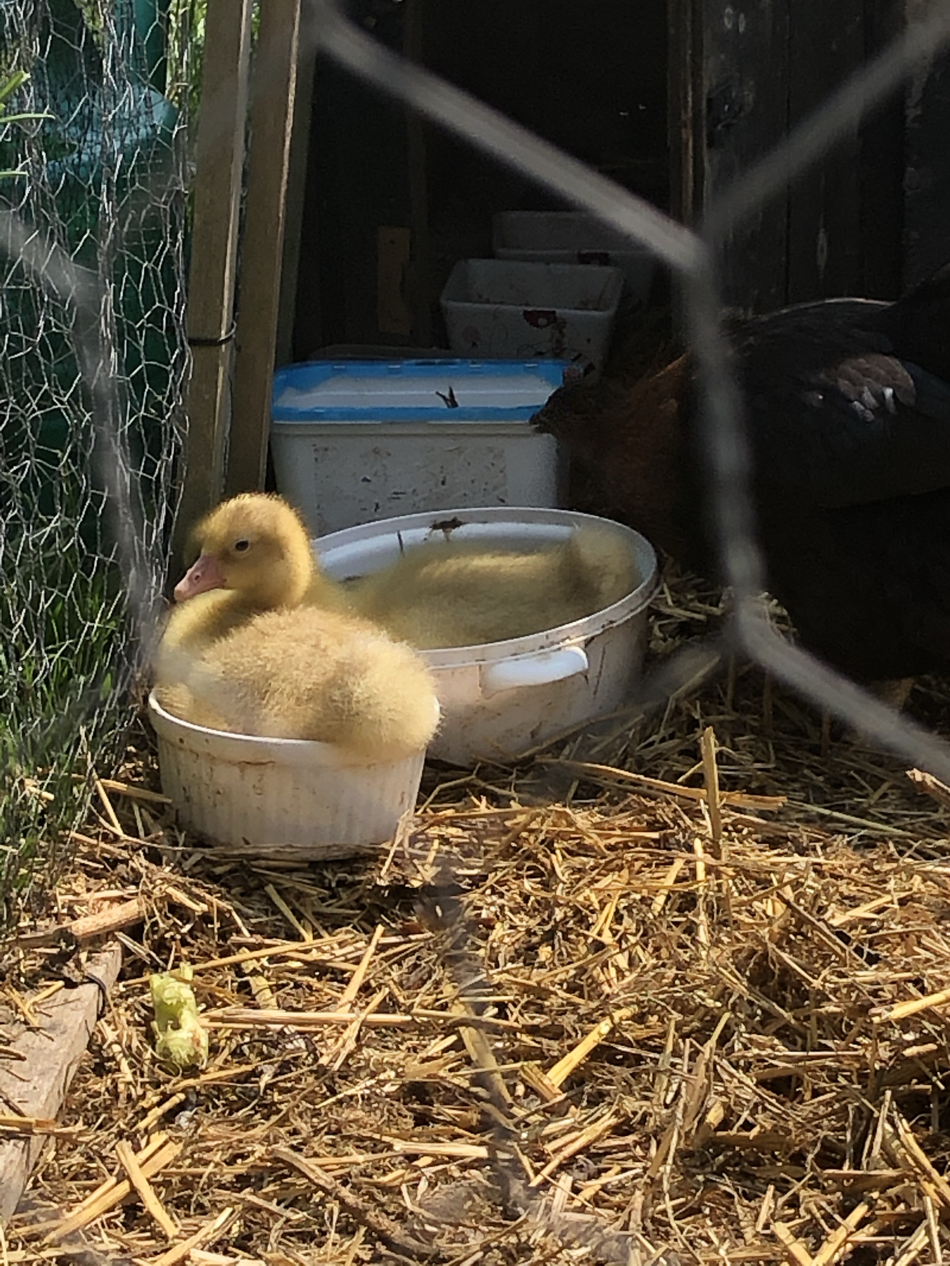 Came home to find the goslings cooling off in their drinking water bowls. Sensible babies!