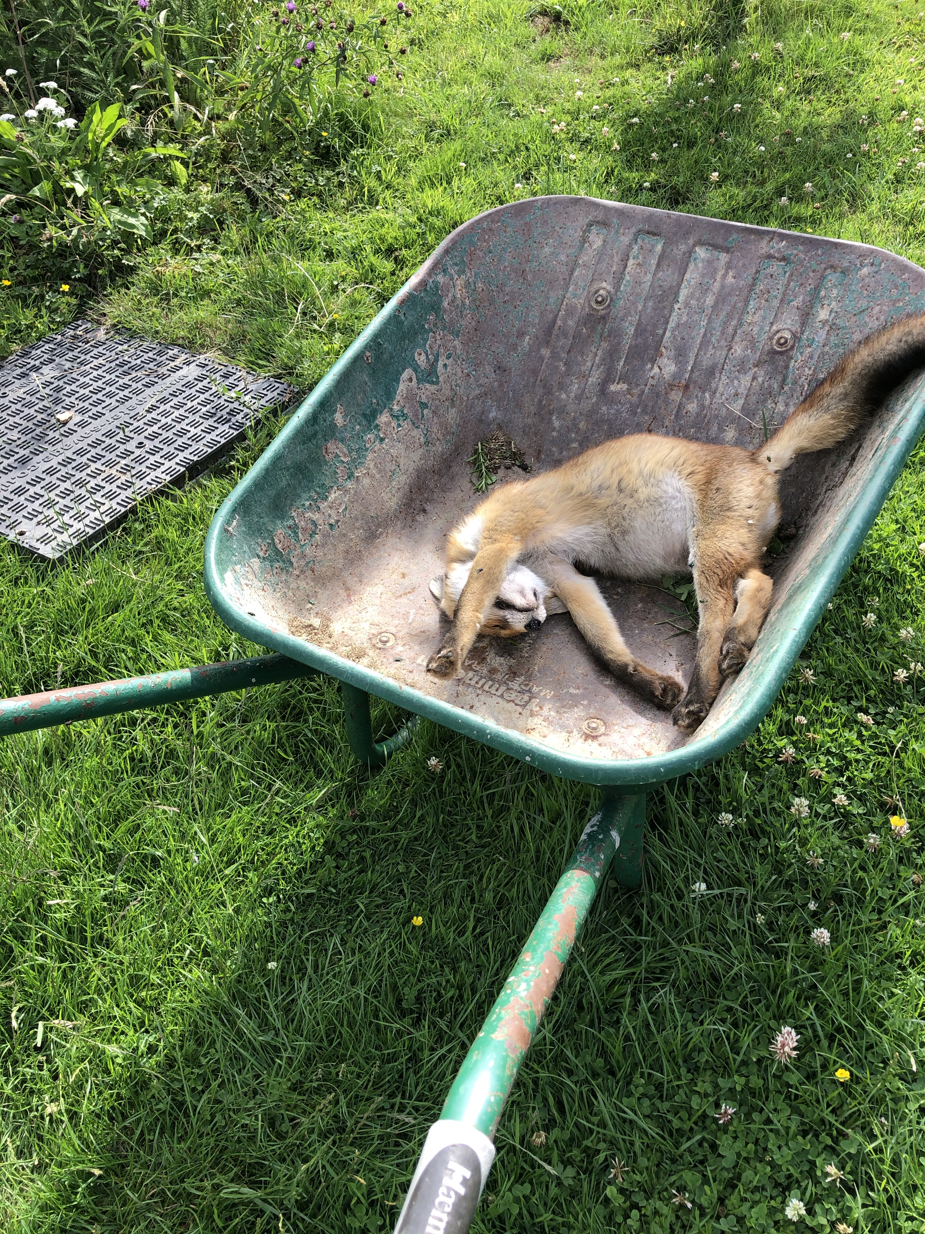 She was probably out hunting (the geese?) and she managed to tangle herself up in a rope attached to a life ring that we keep beside the goose pond. The noose tightened around her neck and she was dead by the times we spotted her. I don’t want foxes to kill our birds but I mourned the loss of a perfect, young vixen.