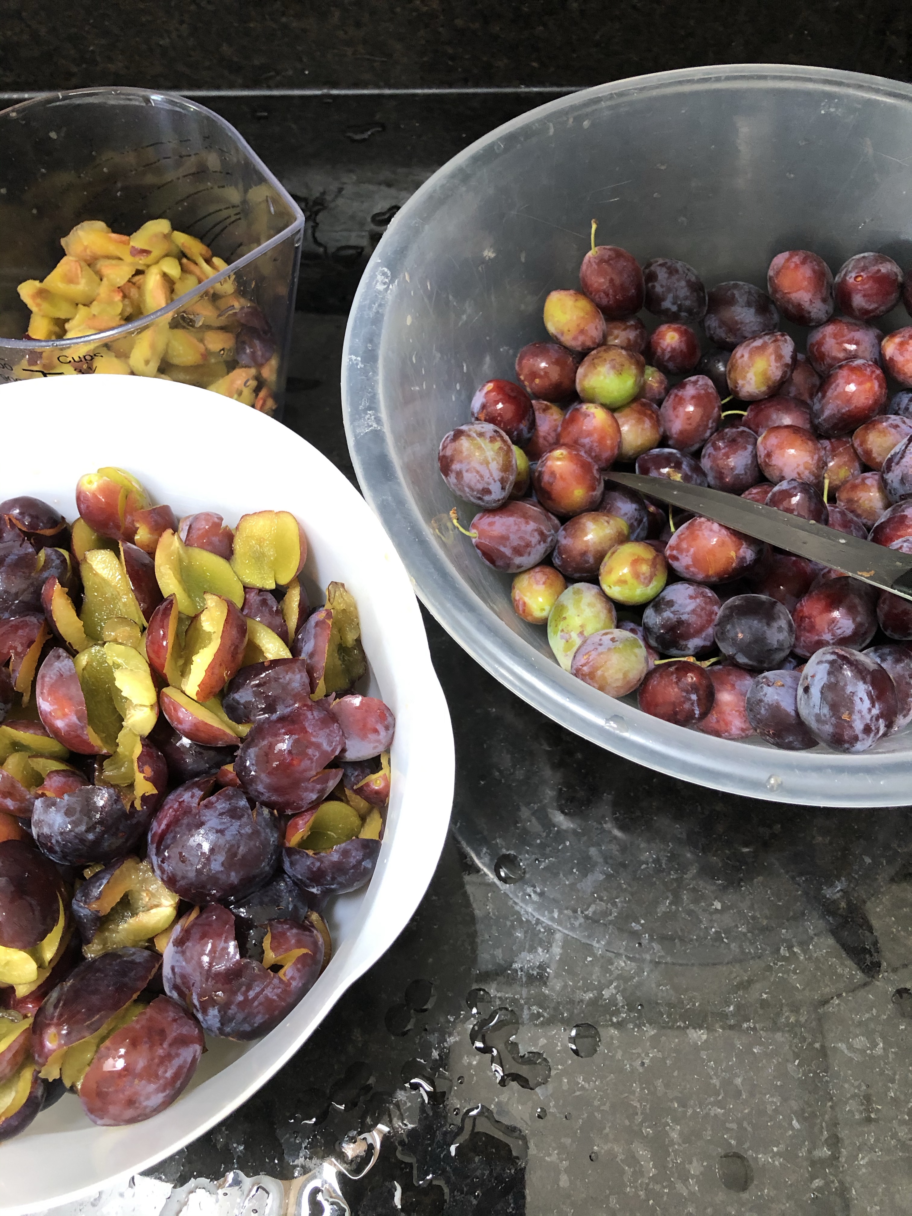 We keep discovering plum trees in our hedges. Plus there are the plum trees that we planted and the amazing Victoria plum tree that we inherited. The plums near the greenhouse were in a tree that we didn’t notice before (how did we miss it?).