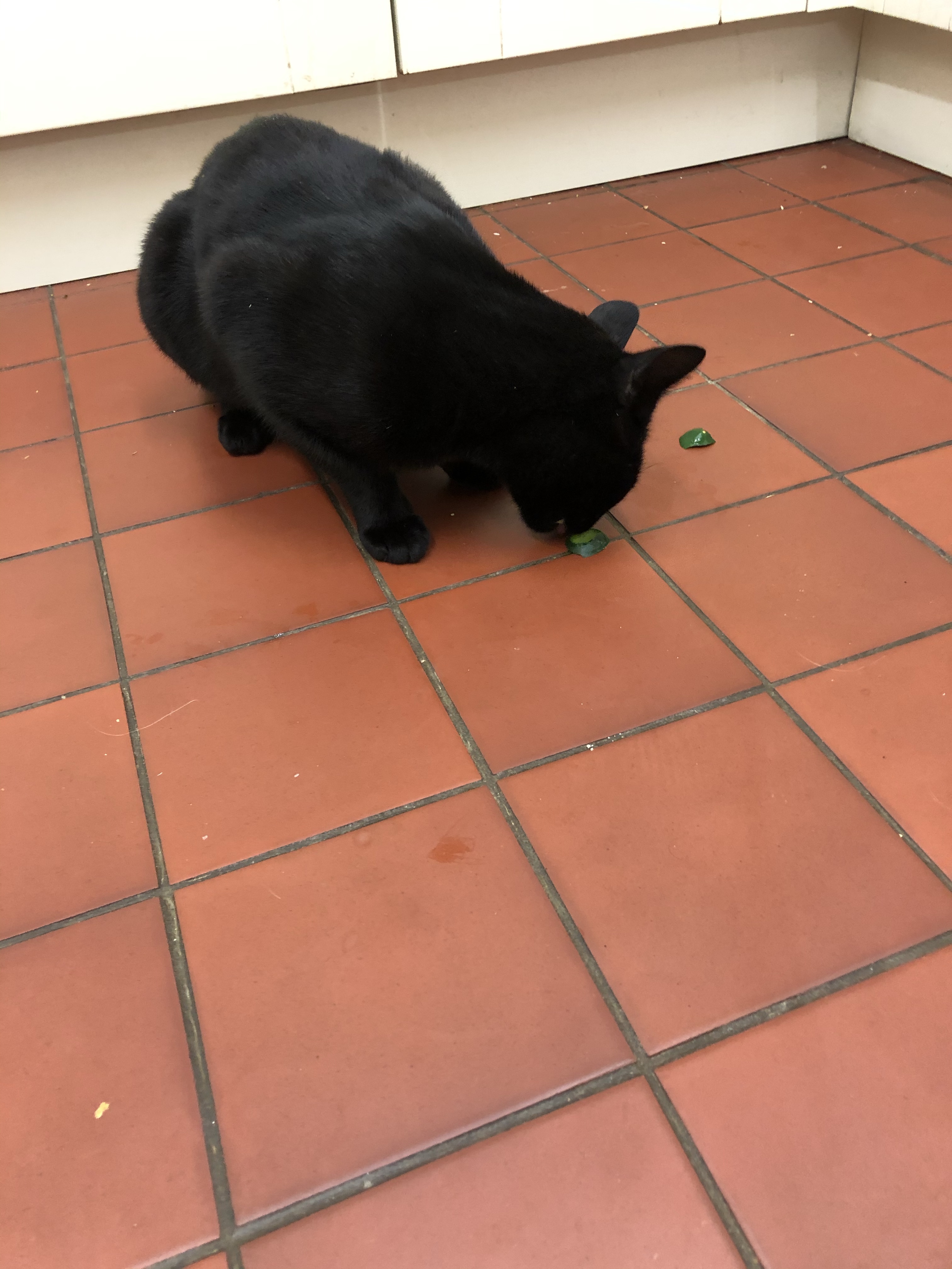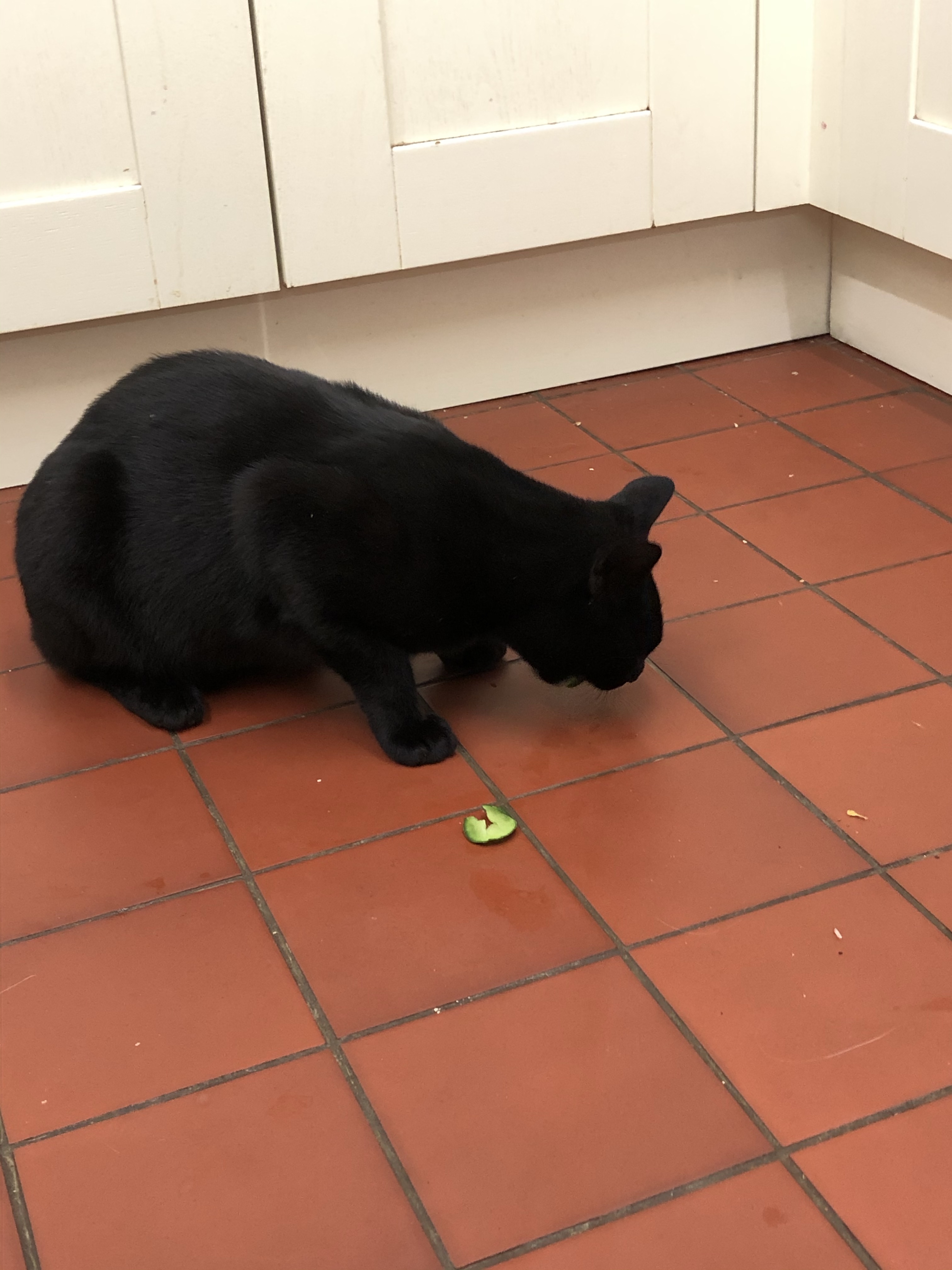 Not many cats care for cucumber. I had forgotten that last year, during cucumber growing season, Nigel happily munched on the vegetable. This evening, as I was slicing a cuke, Nigel padded around my legs until I remembered that he wanted some titbits.